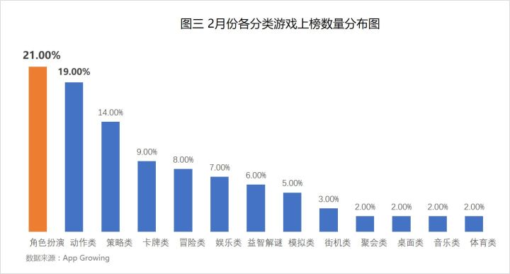 上榜的100款游戏中,有21.0%的游戏为角色扮演类游戏,环比上月(31%)占比明显下降。2月份动作分类与角色扮演类上榜游戏数量占比接近,均为抢量游戏的热门分类。