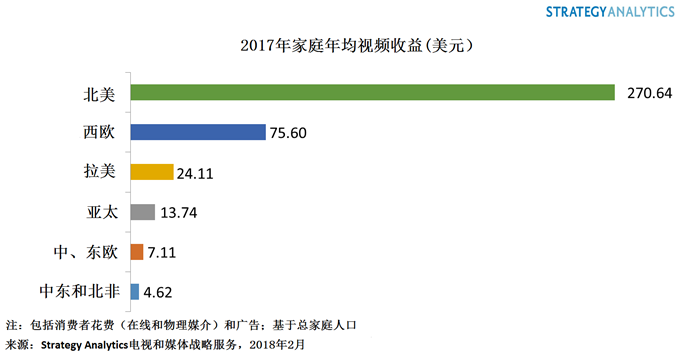 - 家庭年平均视频支出的差异很大,从北美270美元到中东和非洲不到5美元(见图表)