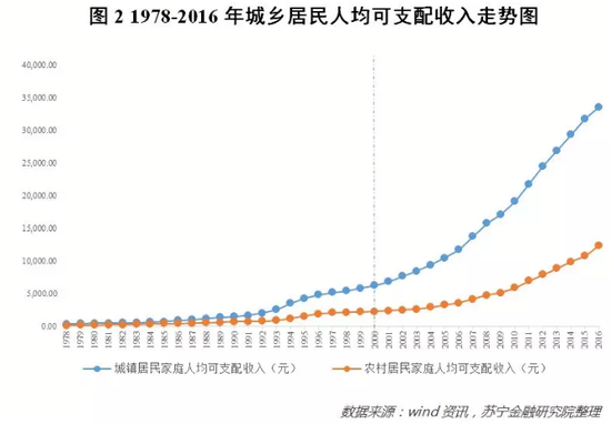 诚然,这与中国人“量入为出”的传统与热衷存钱的习惯不无关系,但更直接的原因恐怕是老百姓收入水平的增长缓慢——毕竟,从数据上看,城乡居民的人均可支配收入在2000年之后才真正进入增长快车道,2000年以前的收入水平大体上没有明显的提升,而这也无形中巩固了人们省钱与存钱的观念,让不爱花钱的惯性一时间难以改变(参见图2)。