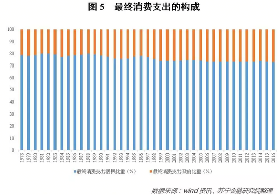 明确了“居民消费只是最终消费的一部分”后,我们可以进一步对最终消费支出的构成加以考察。不难发现,改革开放至今,居民消费支出与公共消费支出均呈现出不同程度的上升趋势,而居民消费支出占最终消费支出的比重一直稳定在70%~80%这一区间内(参见图4、图5)。