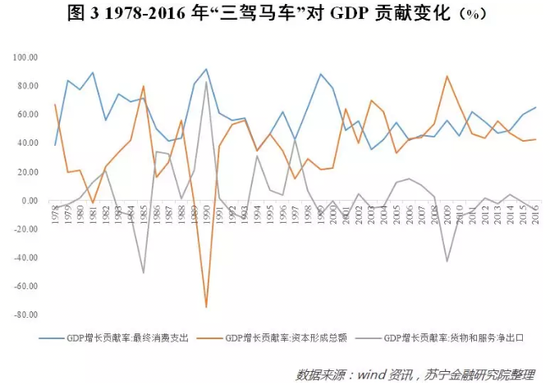 且慢,现在高兴未免太早了。不信,我们拉长历史再看“三驾马车”对GDP的贡献变化,绝对是别有洞天。