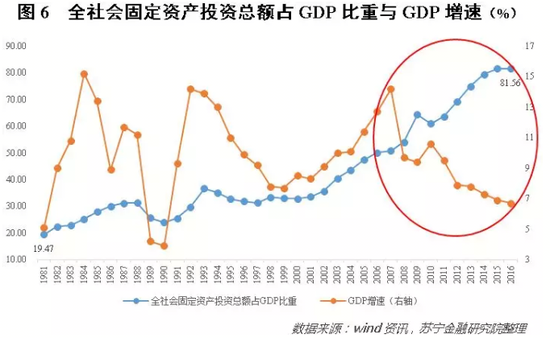 换个思维,如果将“固定资产投资总额”这一指标纳入考察范围,我们会发现,全社会固定资产投资占GDP的比重整体上呈现稳步攀升态势——1981年该比重为19.47%,到2016年是81.56%。需要特别注意的是,自2008年以来,随着固定资产投资的不断增加,经济增速反而趋于下降(参见图6)。
