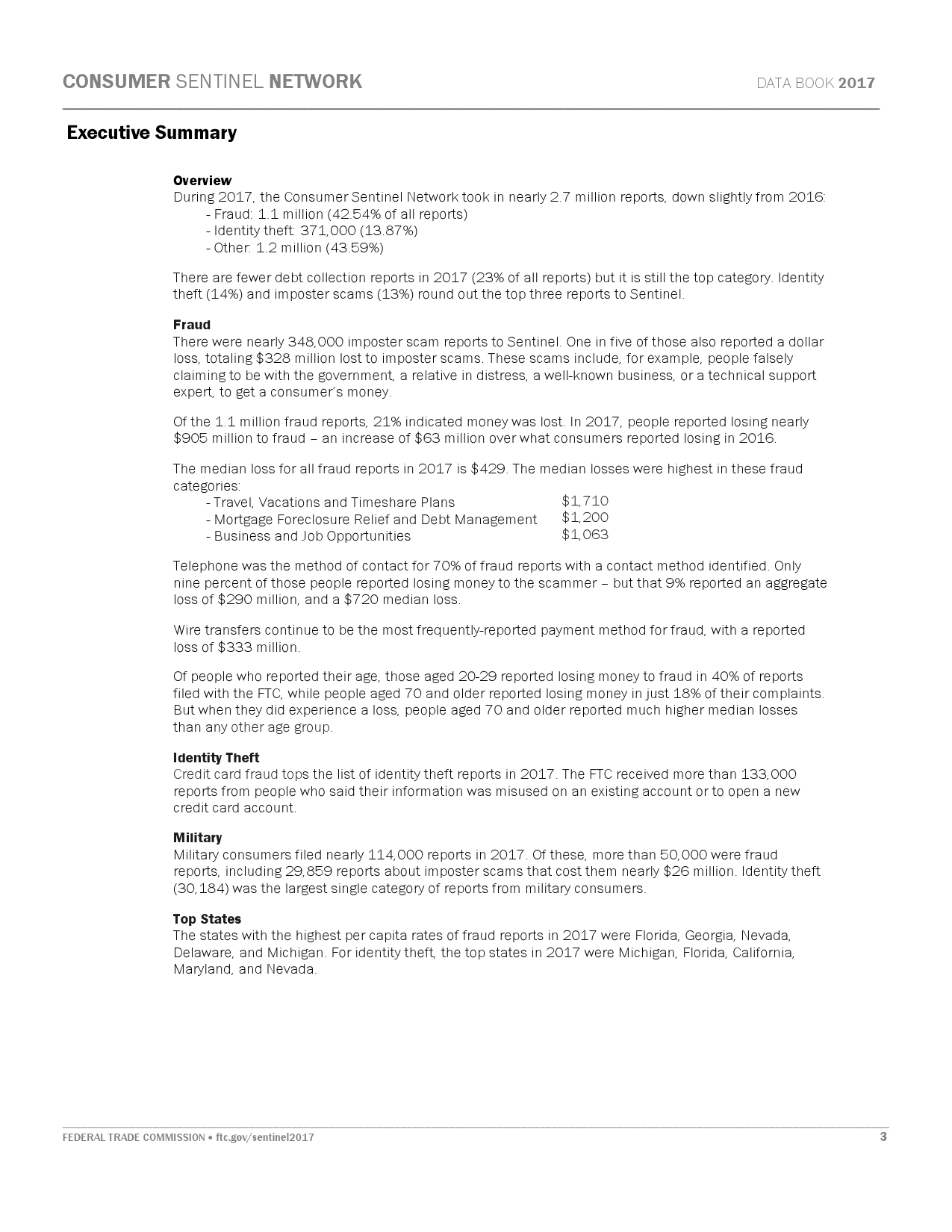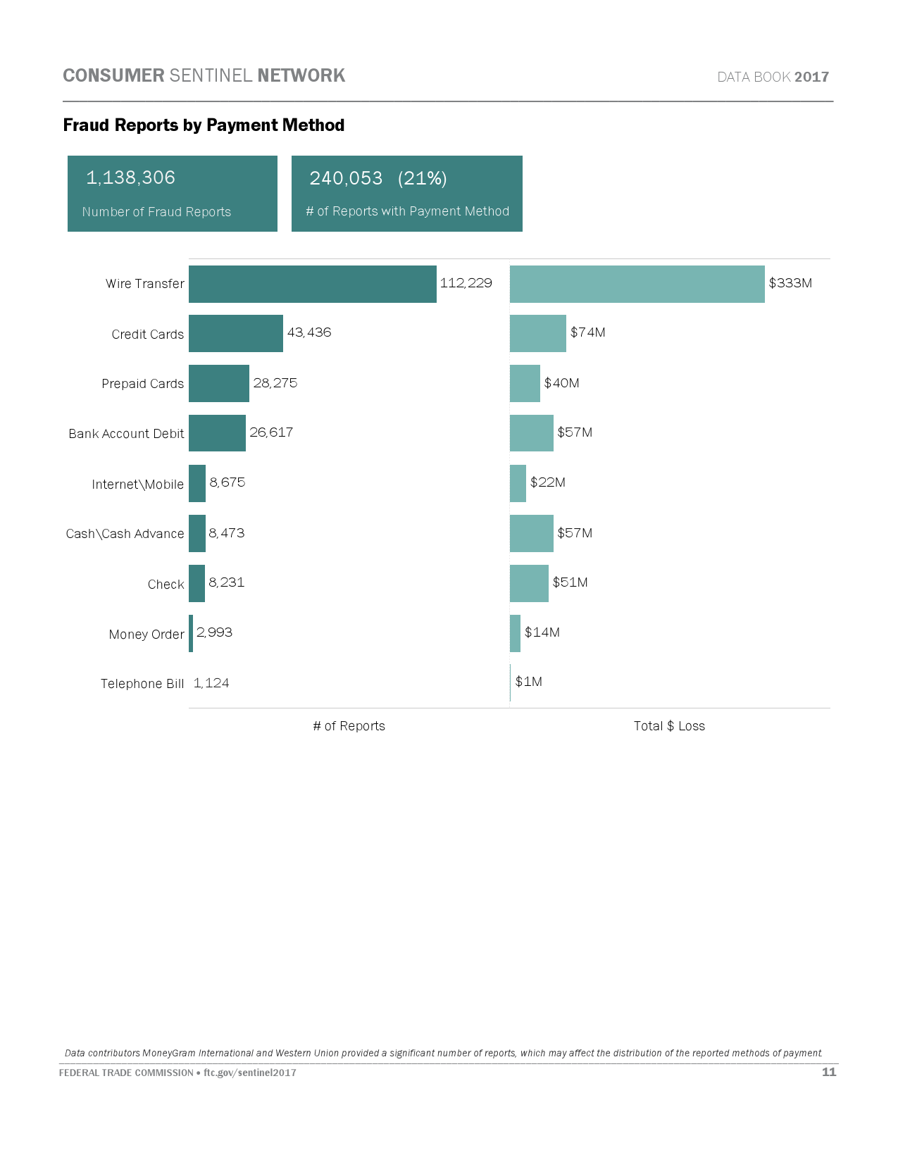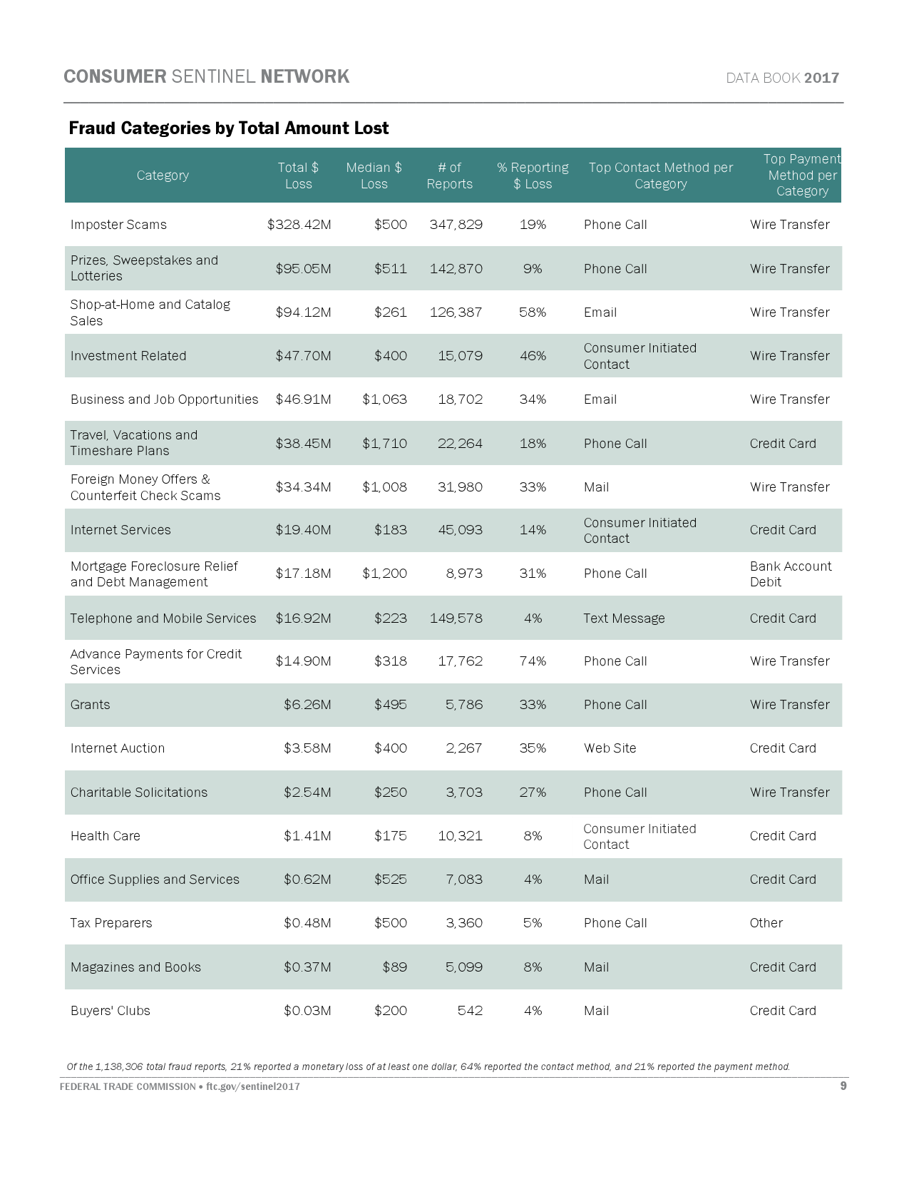 FTC的报告指出,消费者在网络诈骗活动中遭遇的损失总额为9.05亿美元,比前一年上升6300万美元。FTC消费者保护局执行局长汤姆·帕尔(Tom Pahl)表示,在大部分情况下,诈骗者通过电话联系受害人,而资金通过电汇支付。