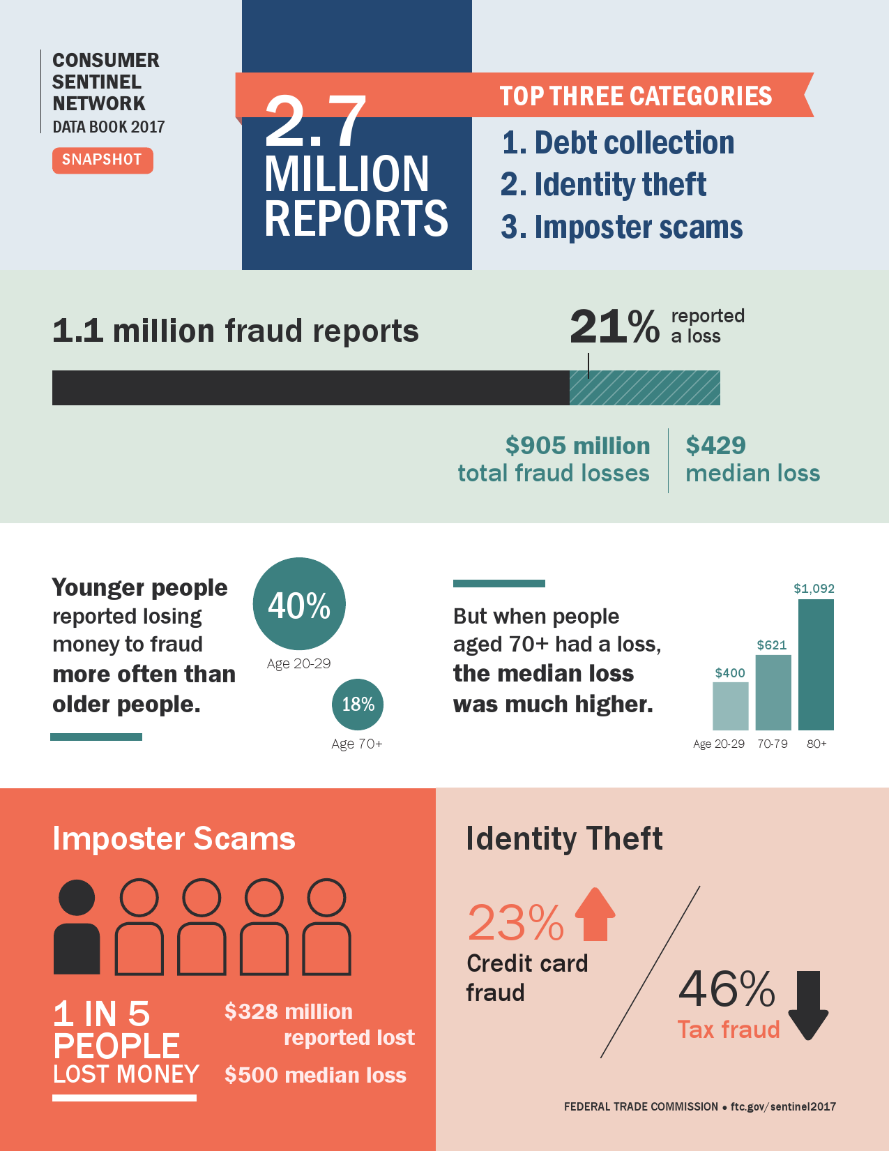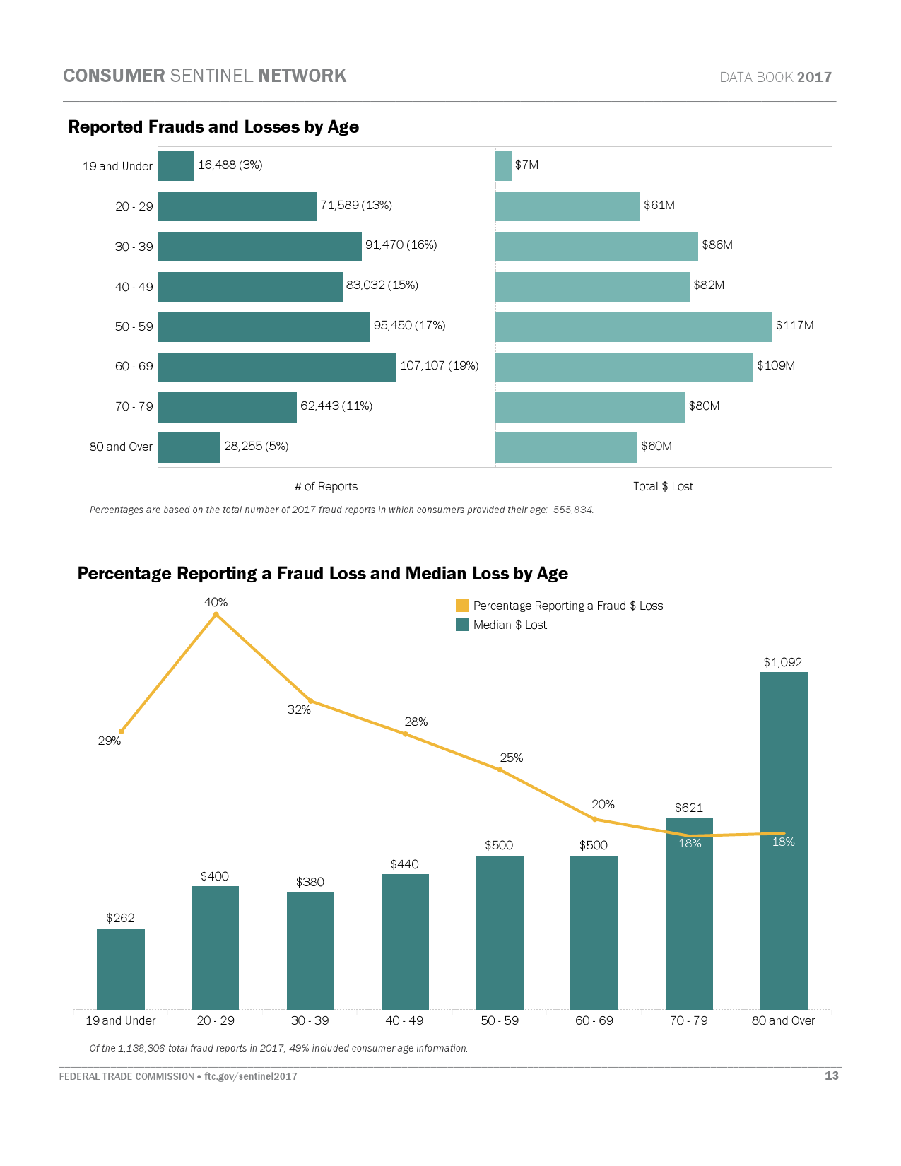 美国联邦贸易委员会(FTC)在2017年“消费者保护数据手册”中对消费者投诉进行了总结。结果显示,与70岁以上老年人相比,20多岁的年轻人更容易由于网络诈骗活动遭遇损失。