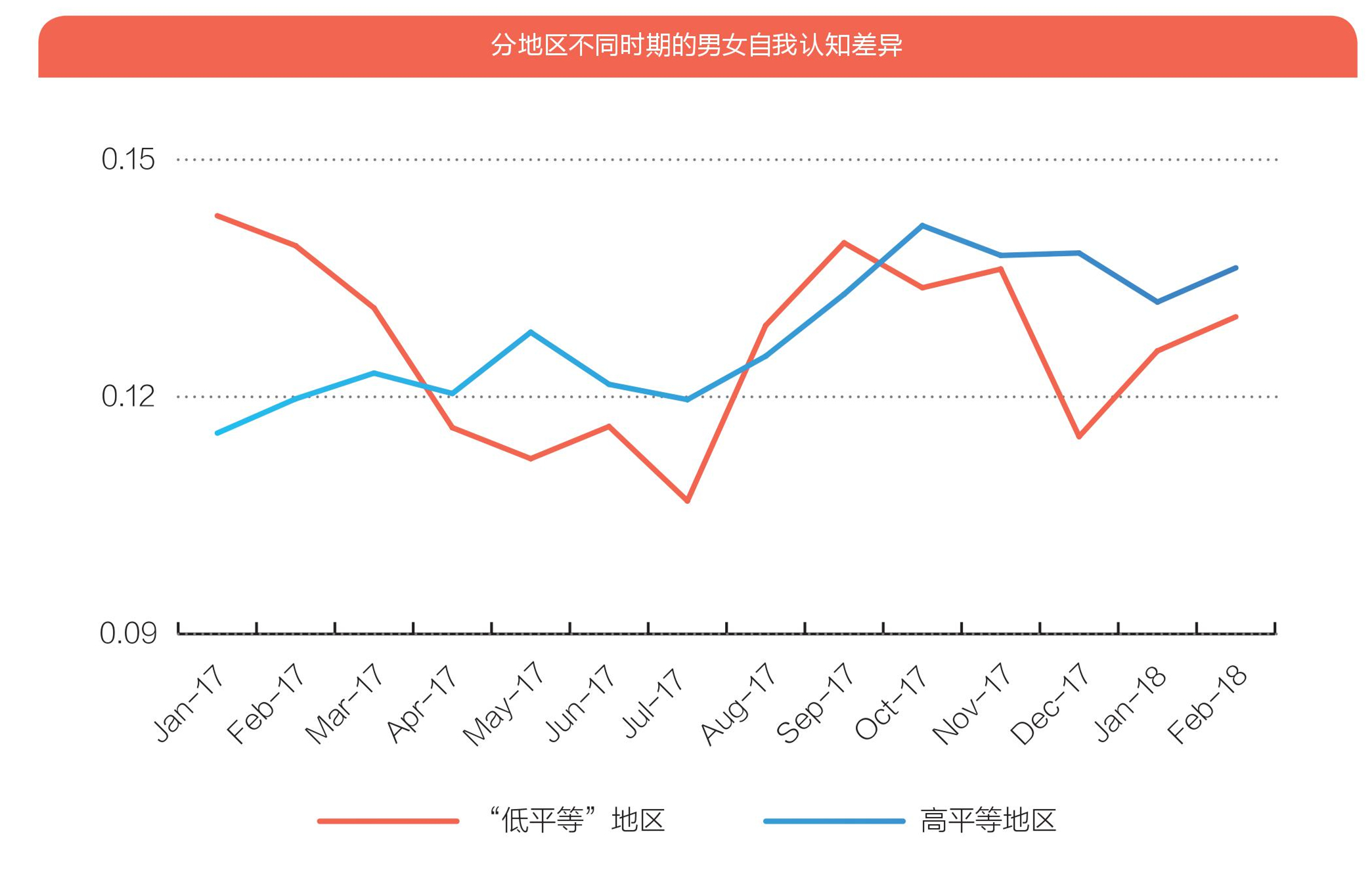可以看到,和“低平等”地区男女自我认知差异保持稳定并不断降低的趋势相反,高平等地区的男女自我认知差异甚至有重新扩张的趋势。