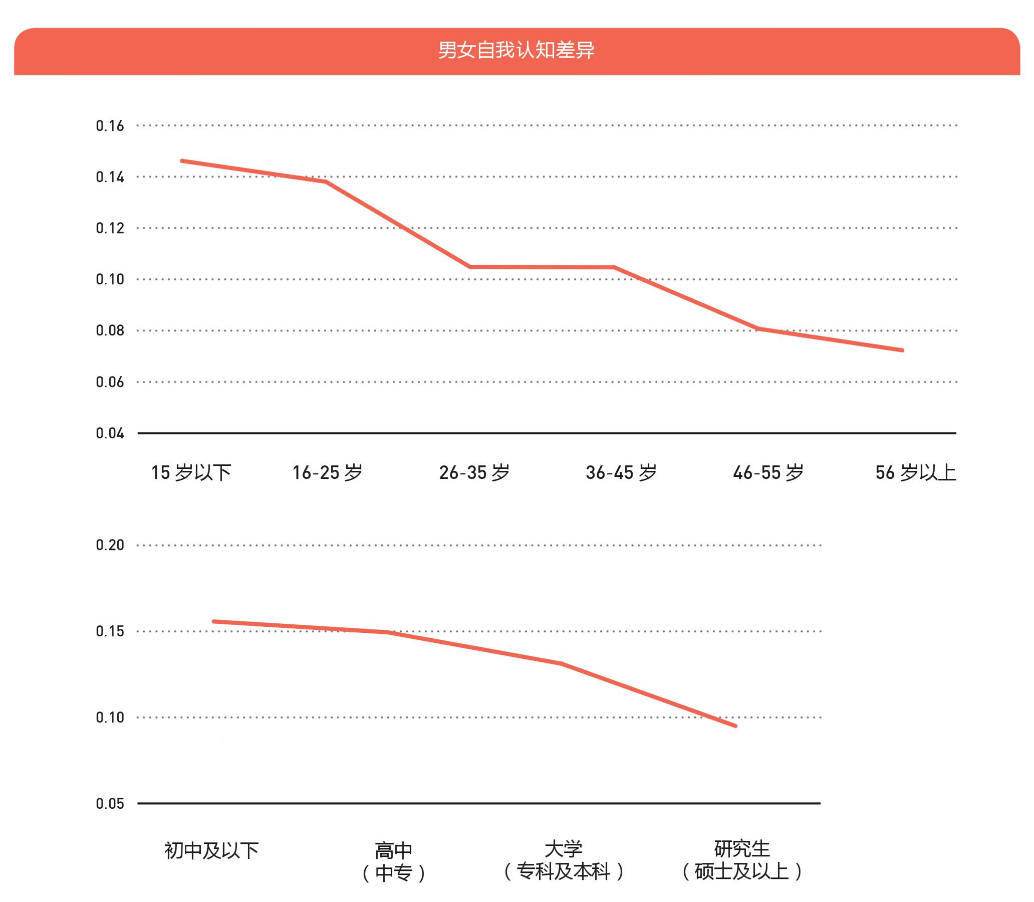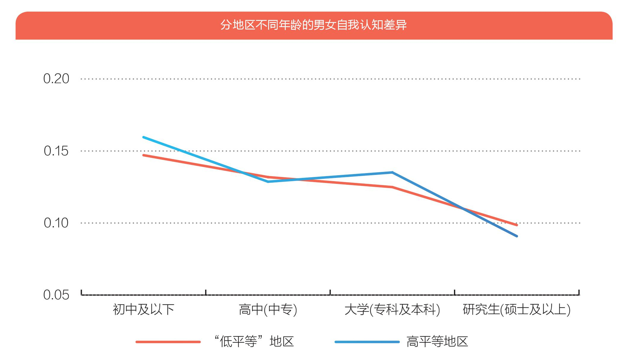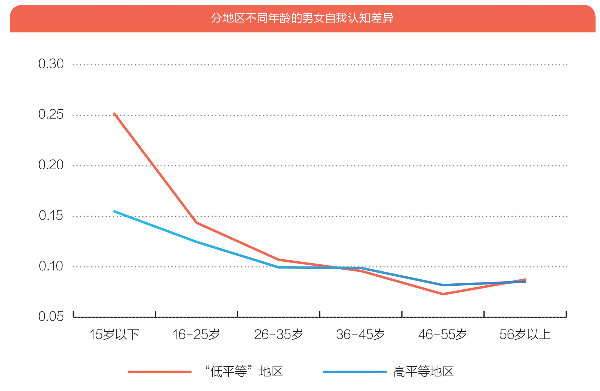 然而对于25岁以下,高中学历以下女性而言,他们的性别自我认知差异正在快速收敛,这种趋势尤其体现在欠发达地区。