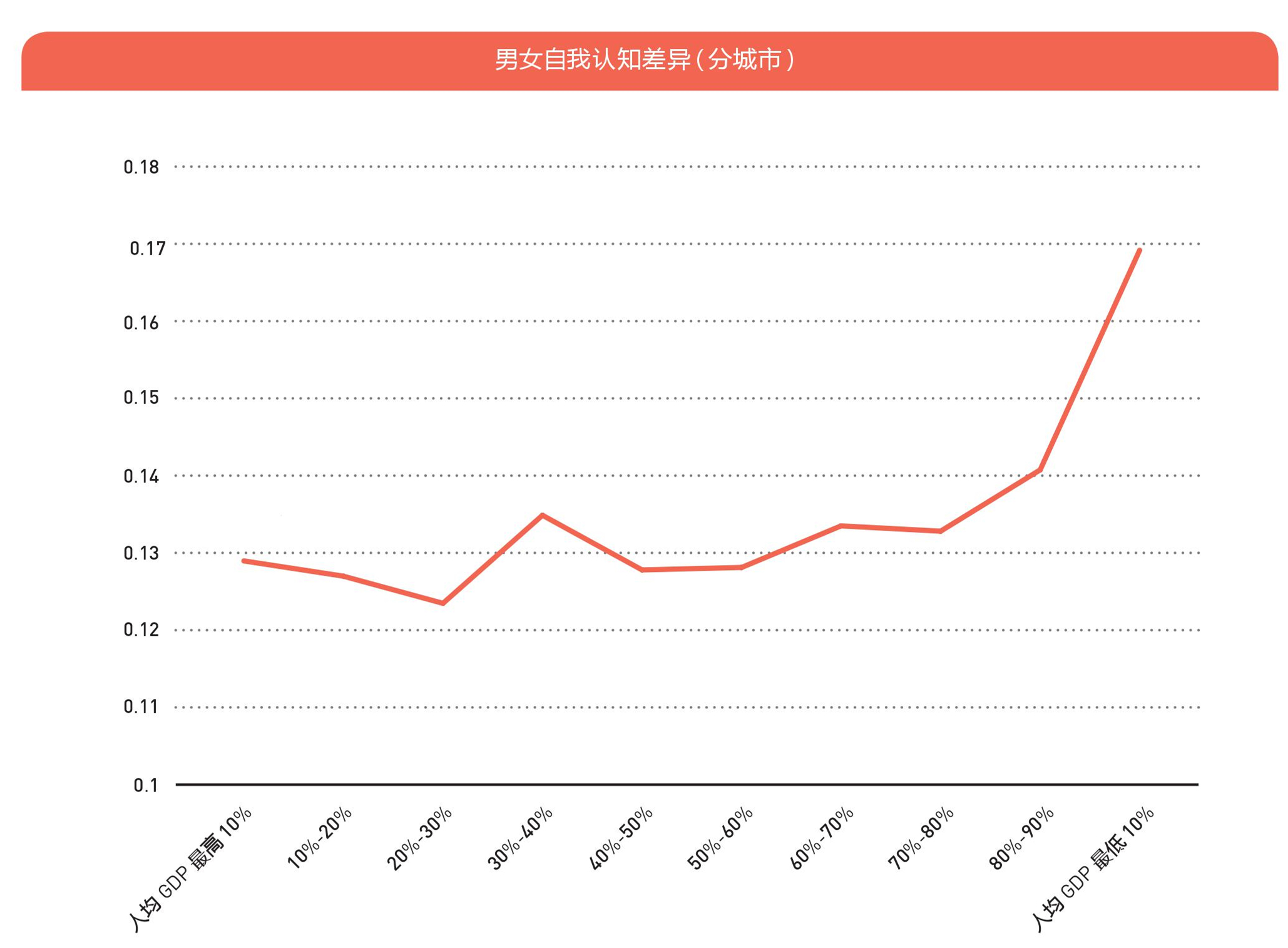 可以看到,城市人均GDP和男女自我认知差异有非常显著的负相关关系。随着城市人均GDP的上升,男女自我认知差异线逐减小。
