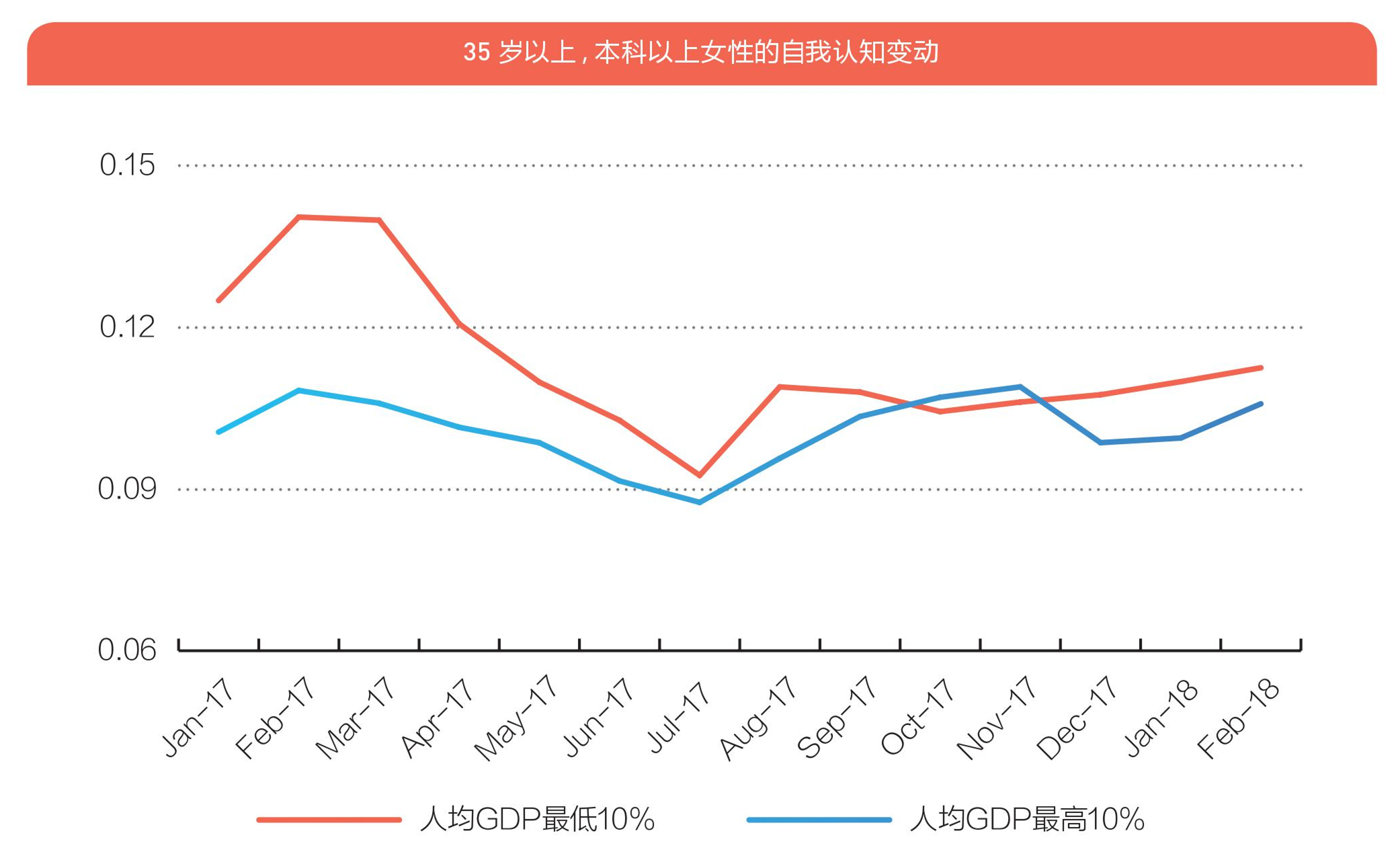 从上两图中我们可以看到,女性自我认知变动的现状并不乐观,但仍然存在亮点。一方面,理应在性别自我认知差异中表现最好的中年以上高学历女性,无论是在发达城市,还是在欠发达城市,其认知状况都没有缩小的趋势。对于发达城市来说,最近半年甚至有所反弹,这点与“高平等”地区的情况非常类似。