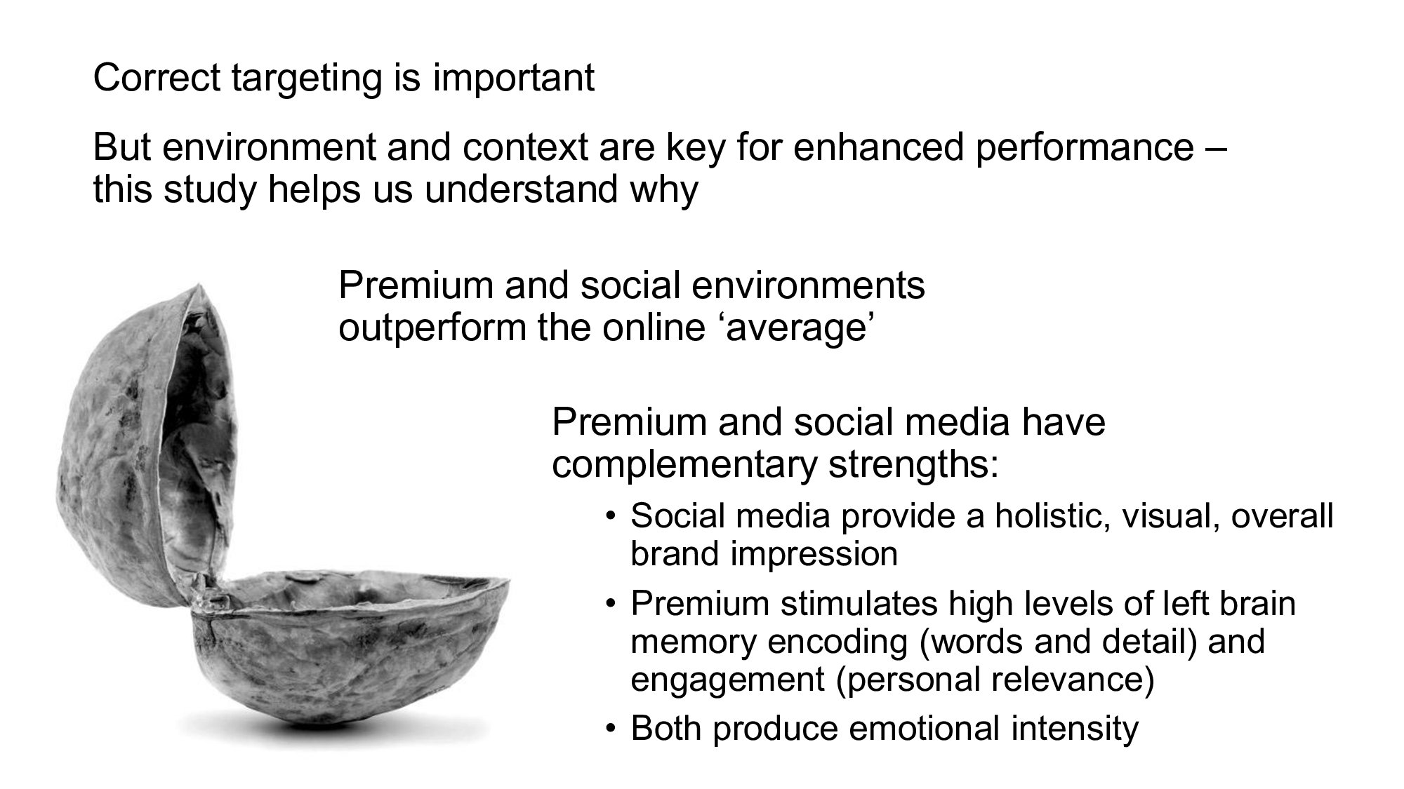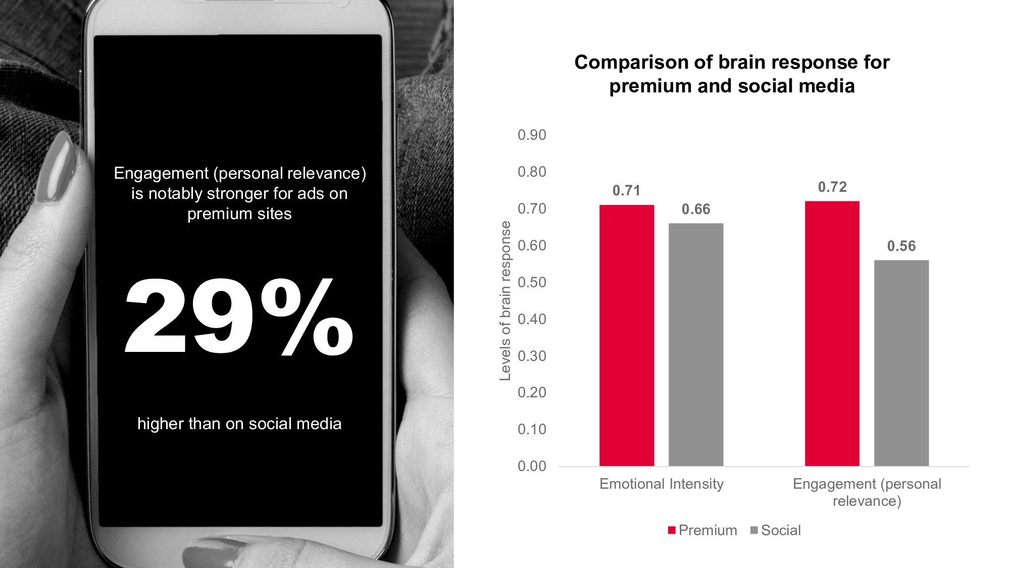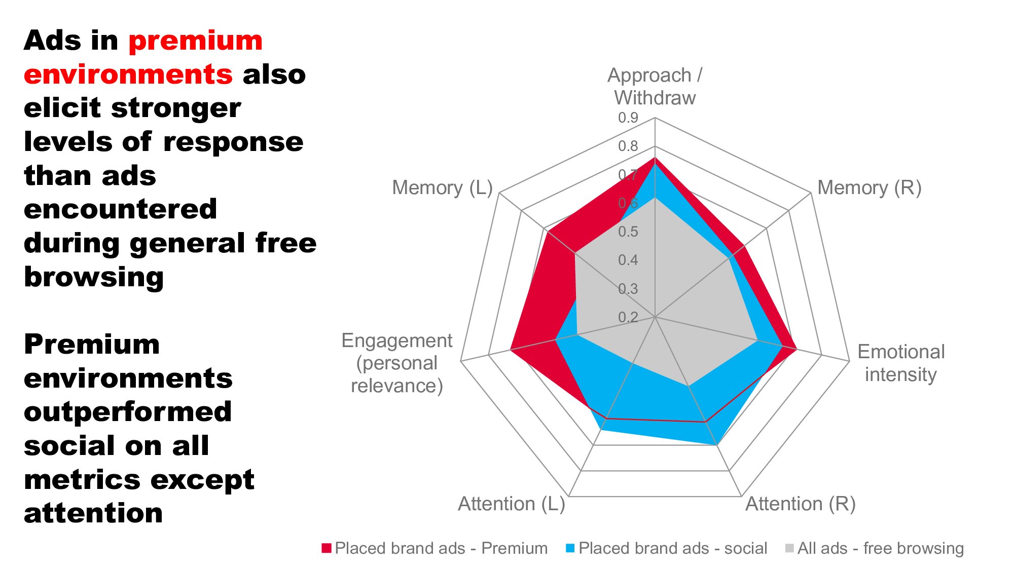 优质环境中的广告比一般网站上遇到的广告产生更强烈的响应水平,除了注意力之外,所有指标都优于社交媒体。