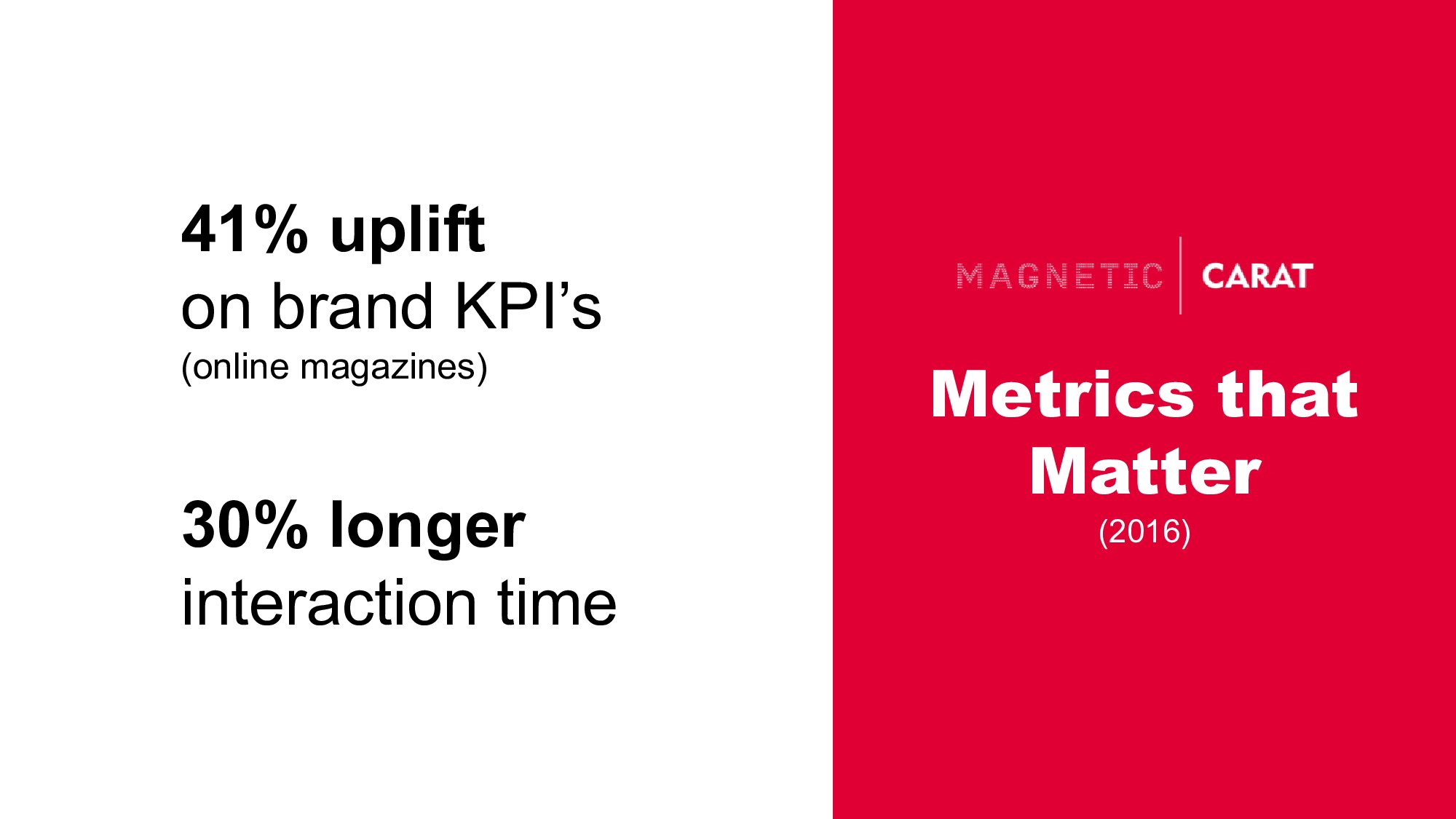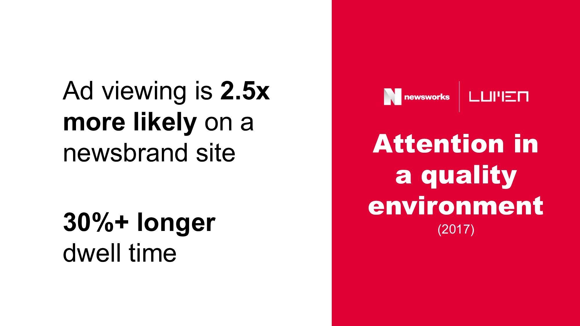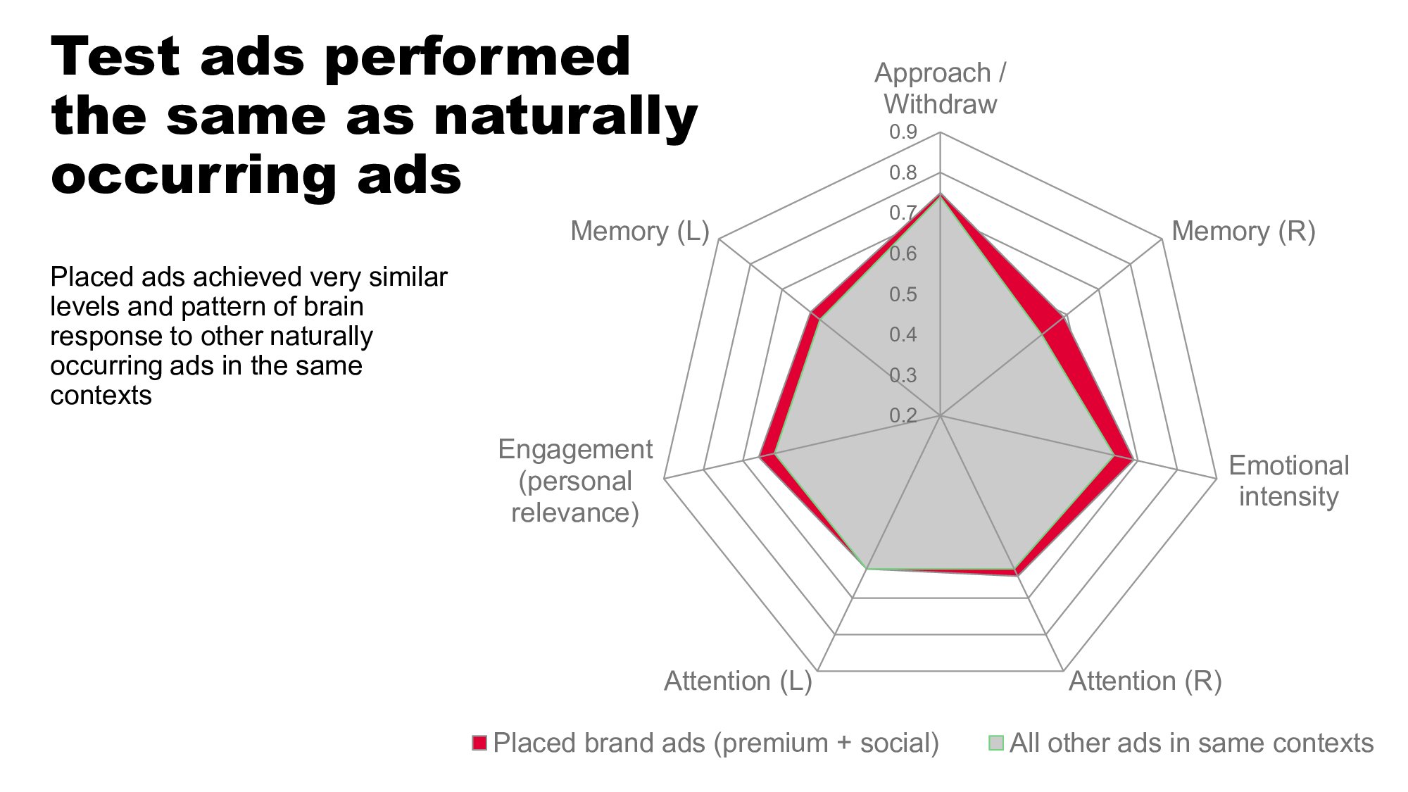 优质环境中的广告比一般网站上遇到的广告产生更强烈的响应水平,除了注意力之外,所有指标都优于社交媒体。