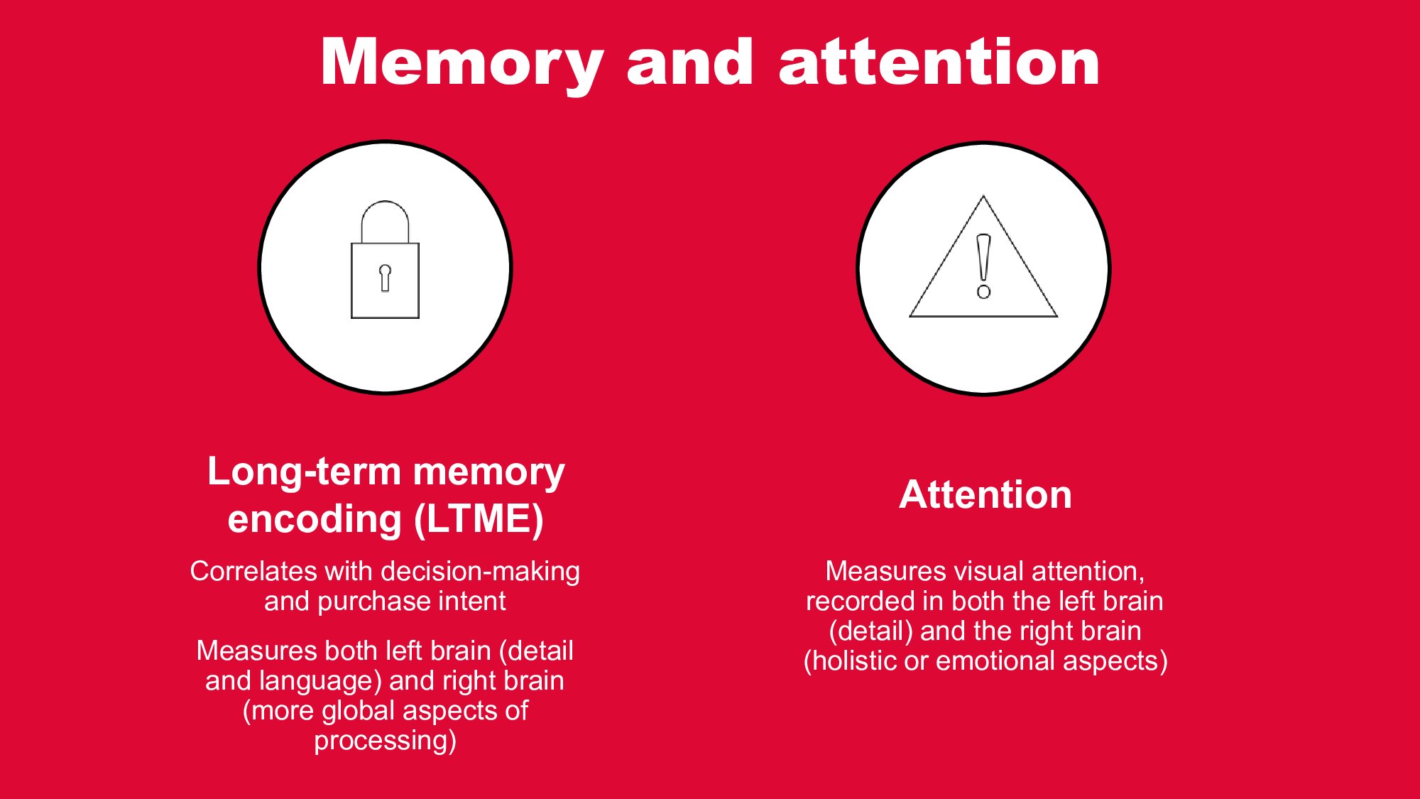 长期记忆编码,记忆编码是关键,因为它与决策和购买意图相关。通过测量左脑(细节和语言)和右脑来衡量。