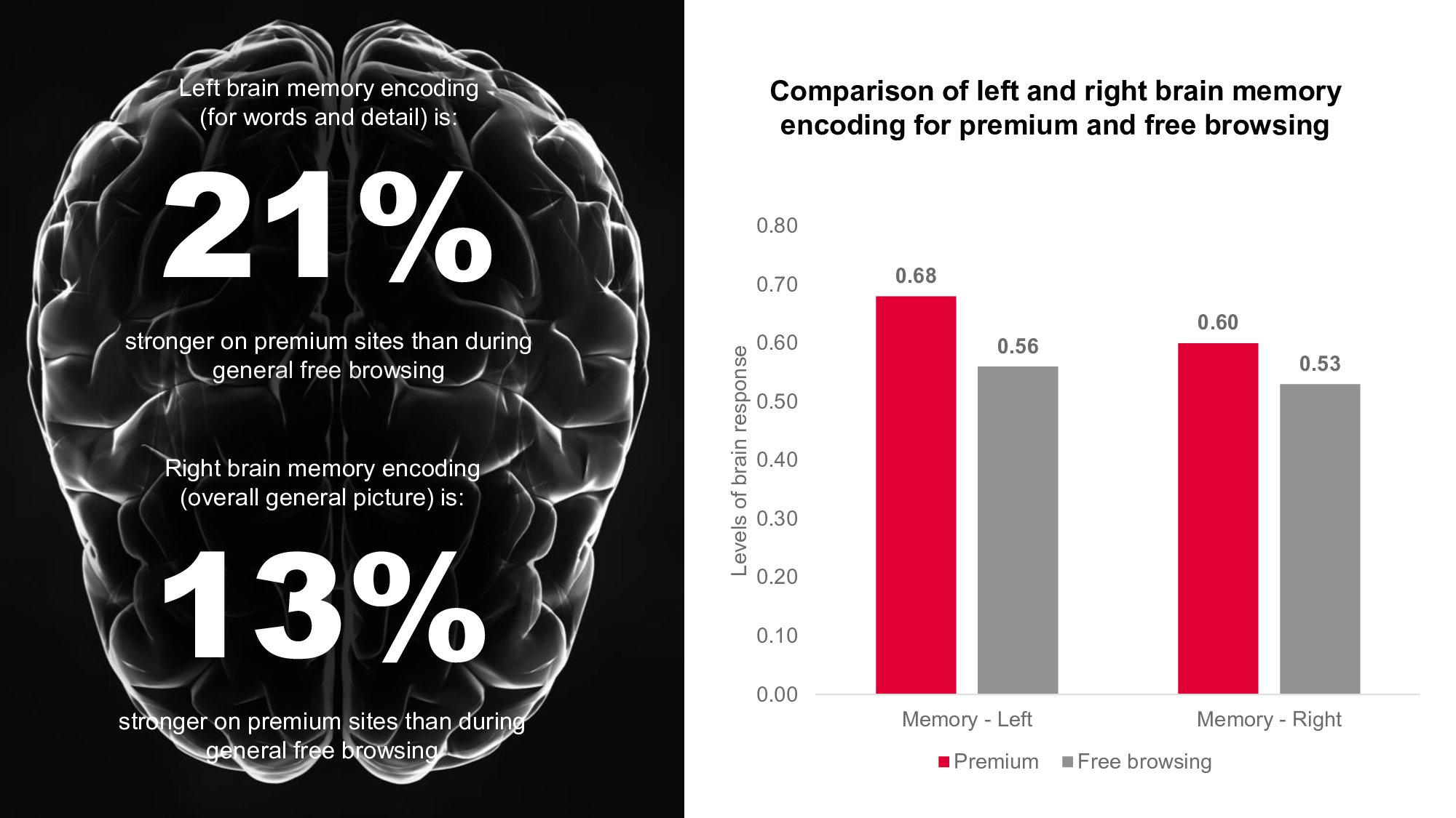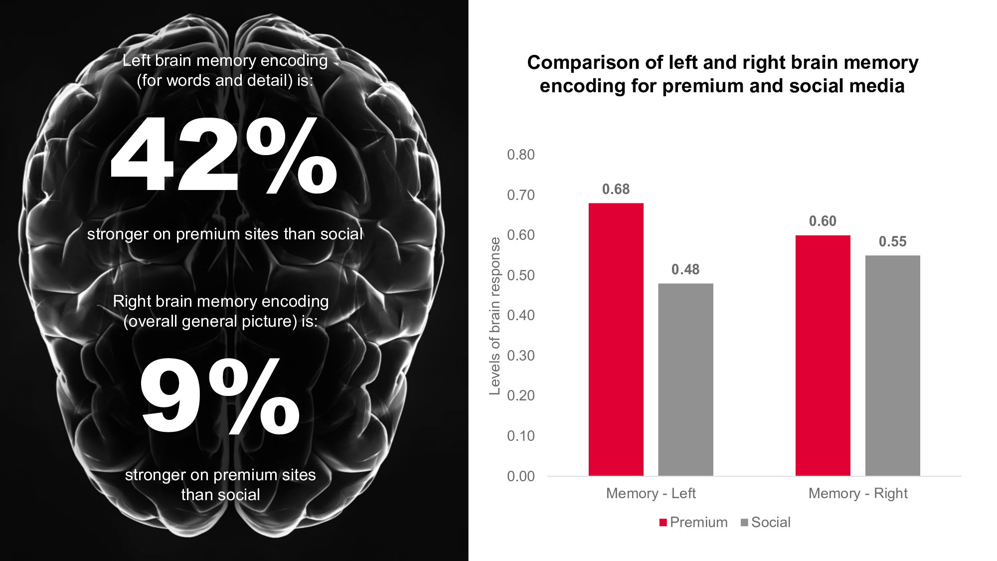 优质网站的右脑长期记忆编码比一般免费网站强13%,比社交媒体强9%;