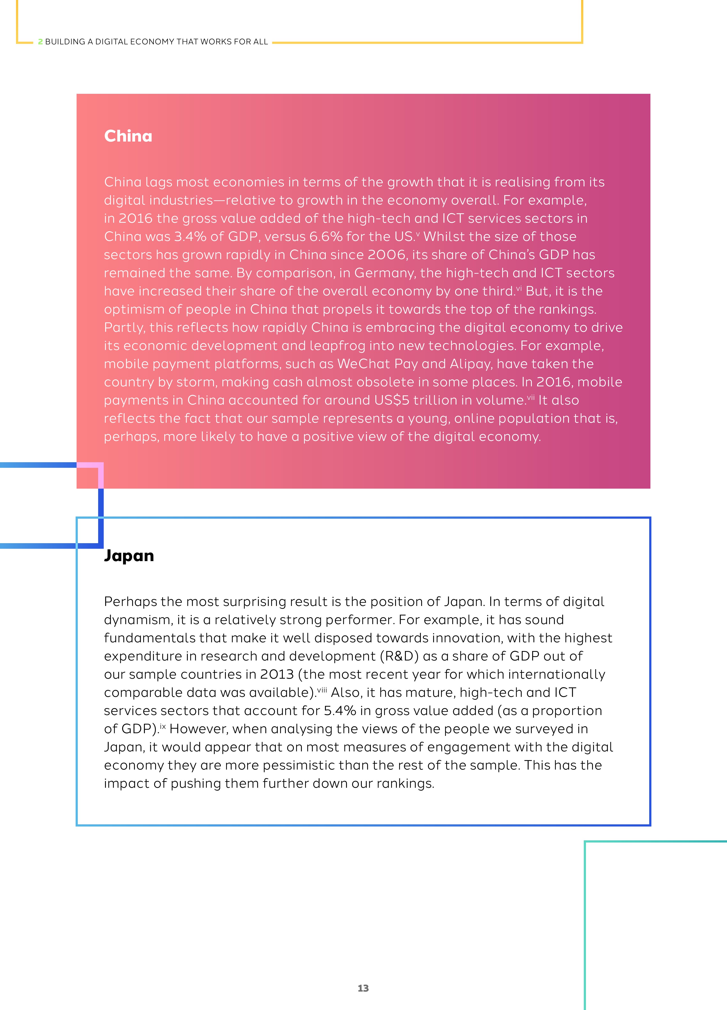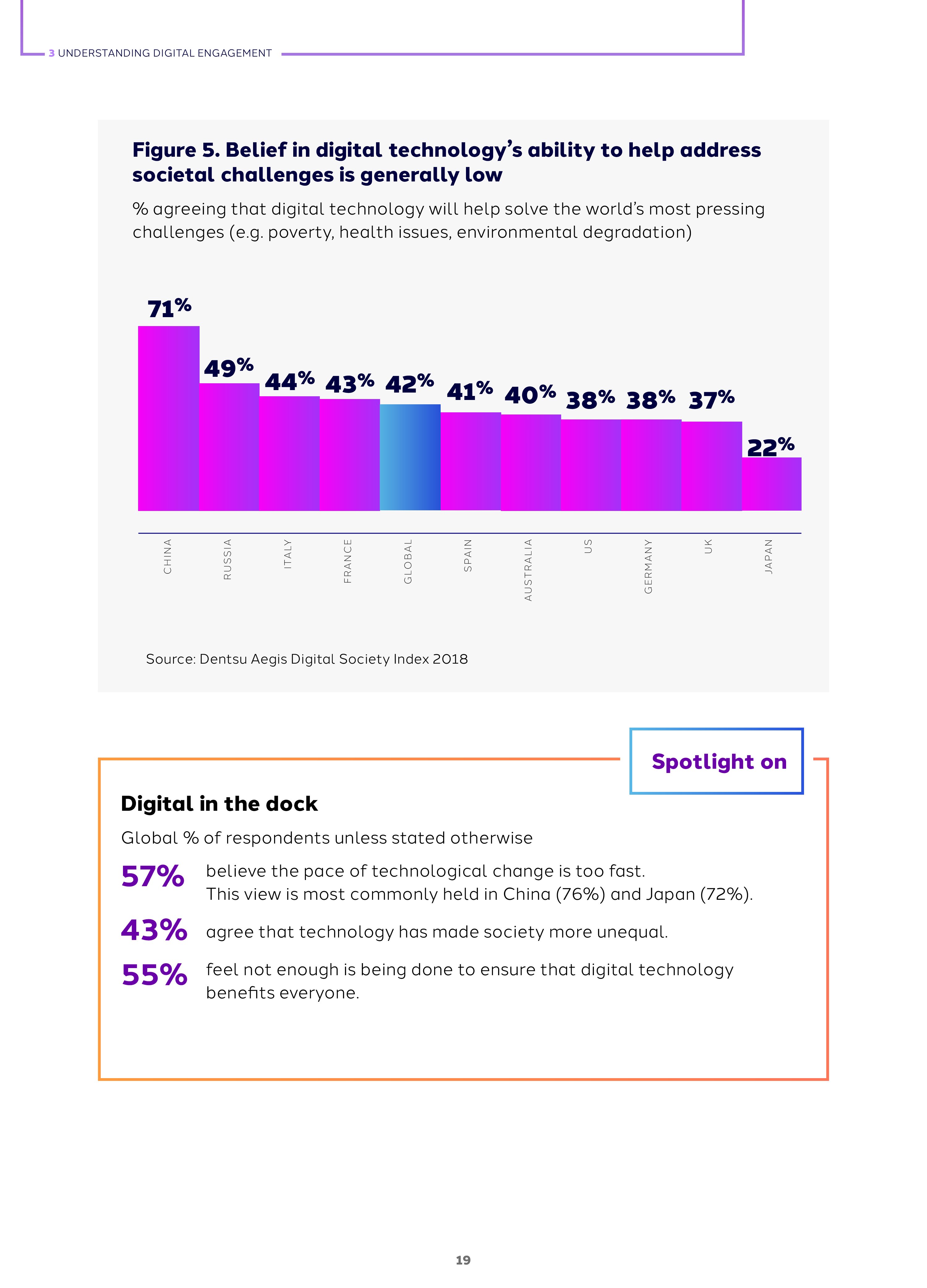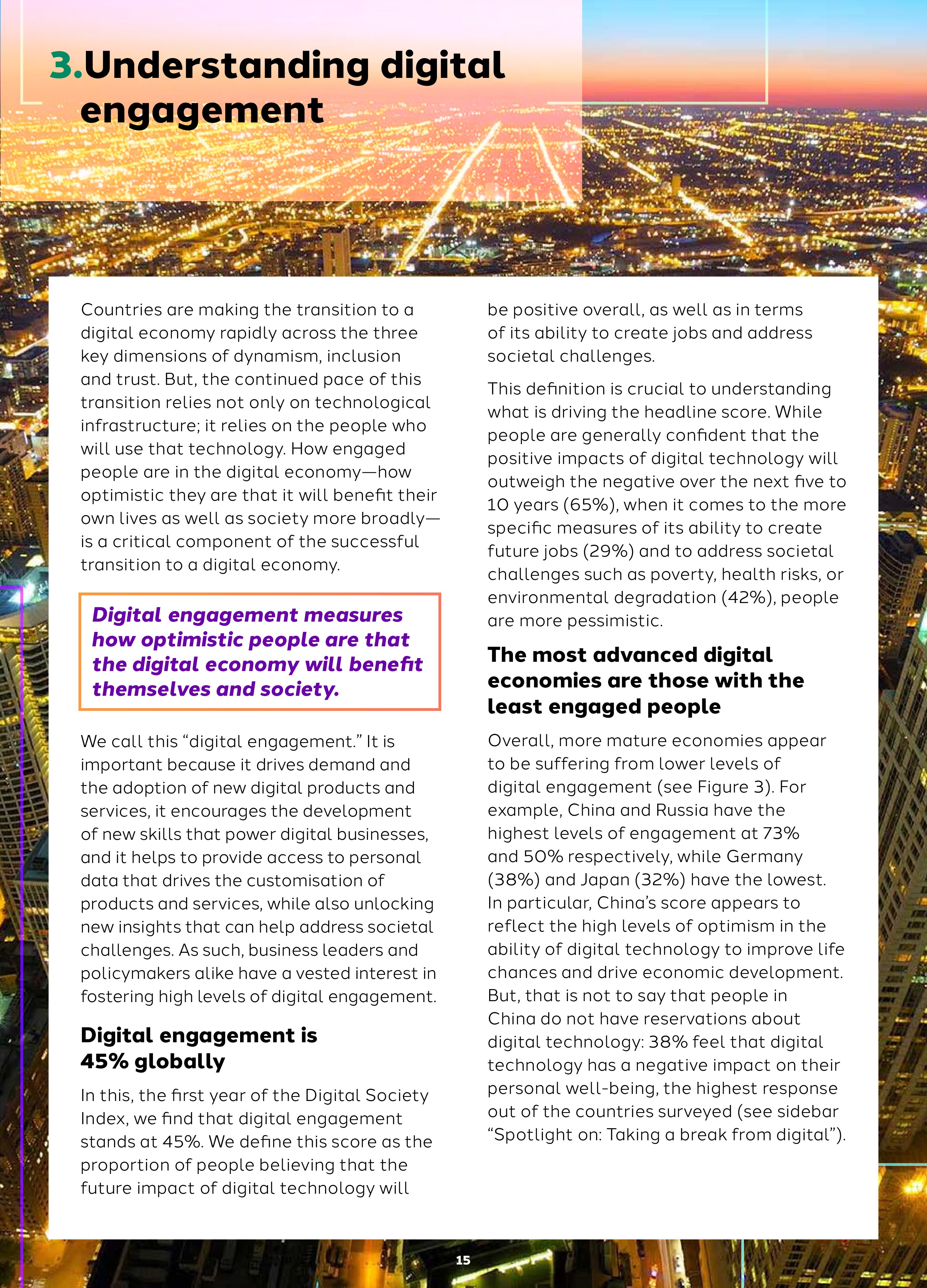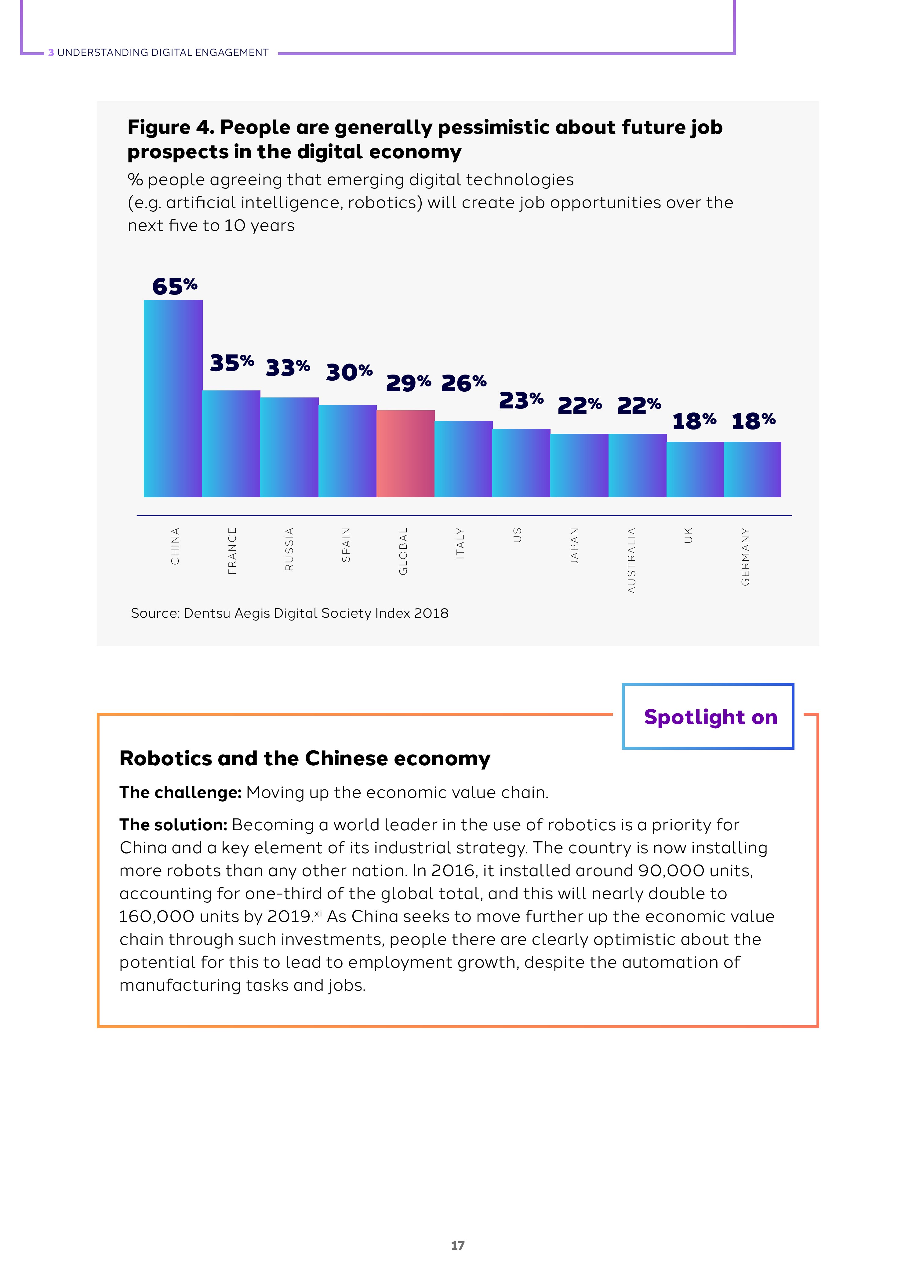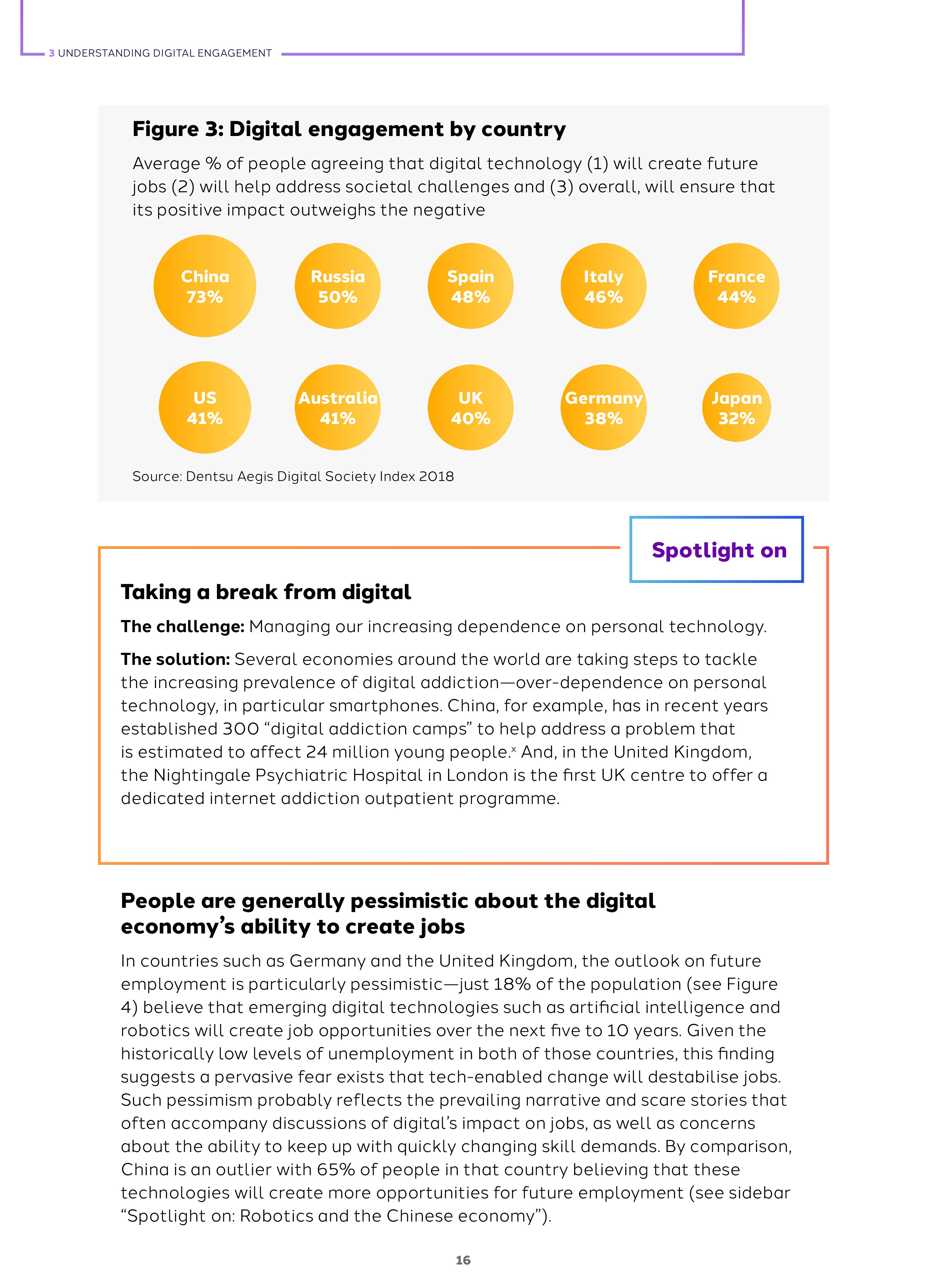 2018年全球网络参与度是45%,这是基于人们对网络创造工作、解决社会挑战的积极看法超过负面态度得出的数字。而全球各国的指数差异很大,例如,日本是32%,德国是38%,俄罗斯是50%,中国是73%。网络参与度与包容和信任有关,和活力无关。
