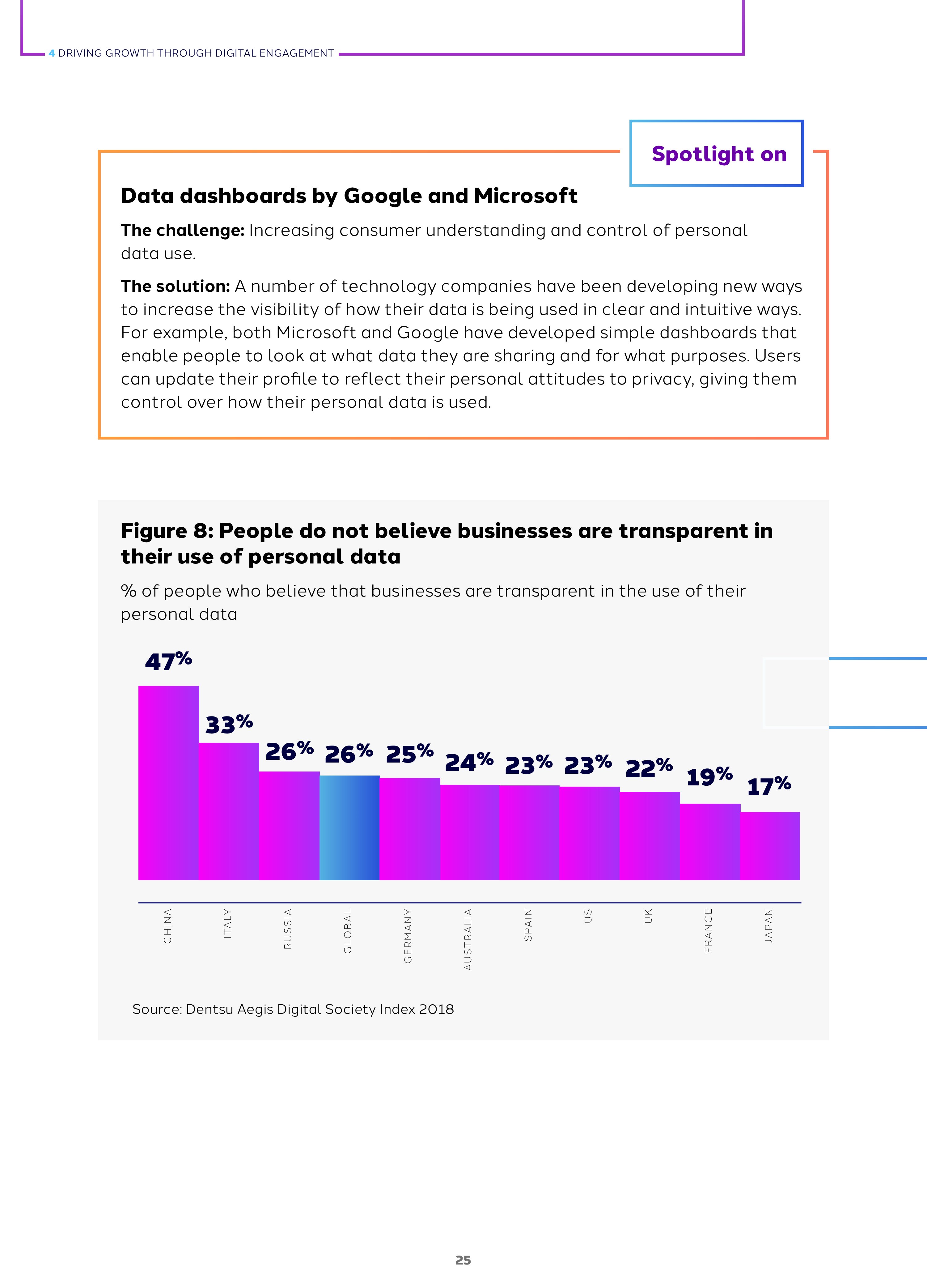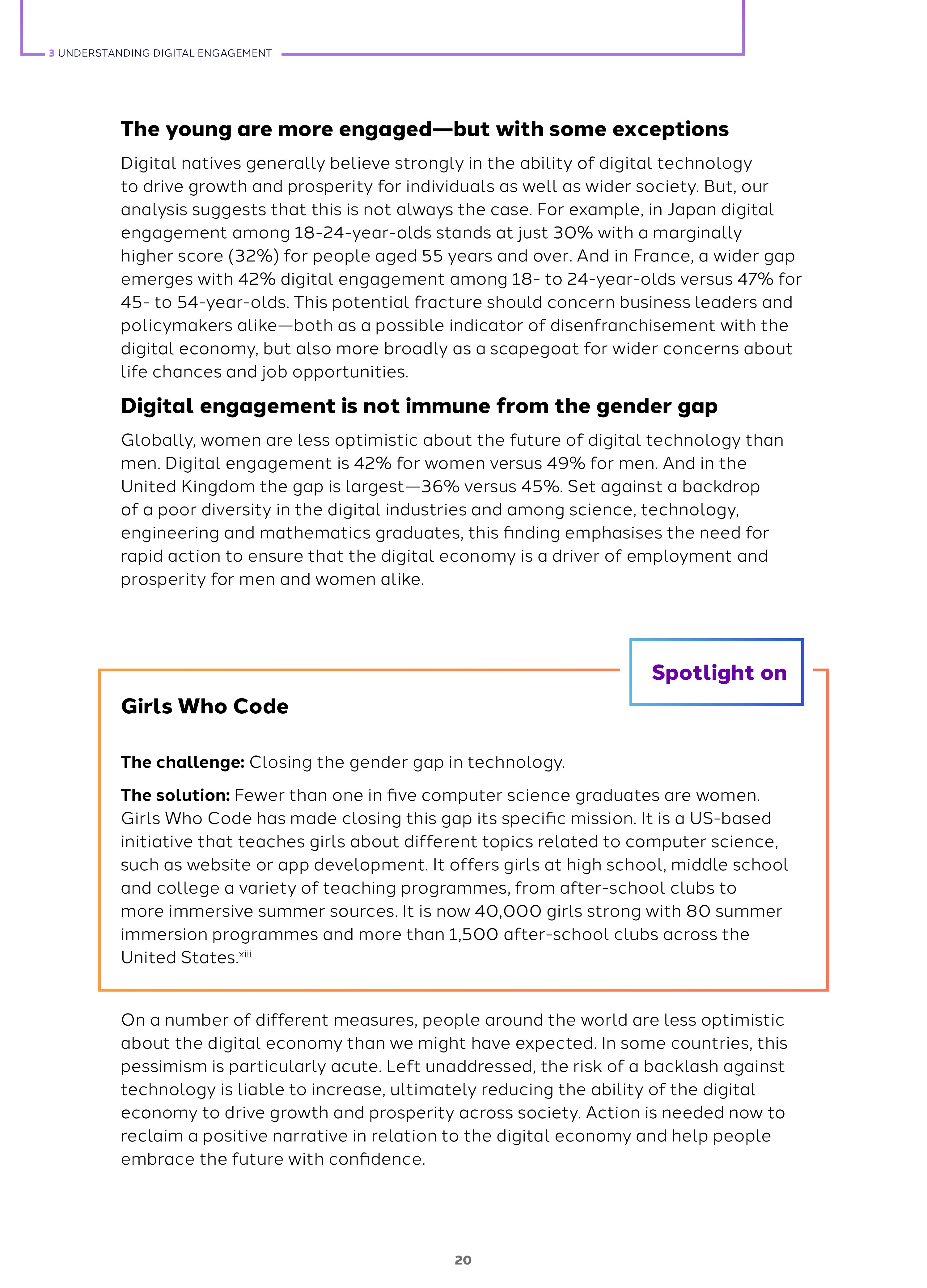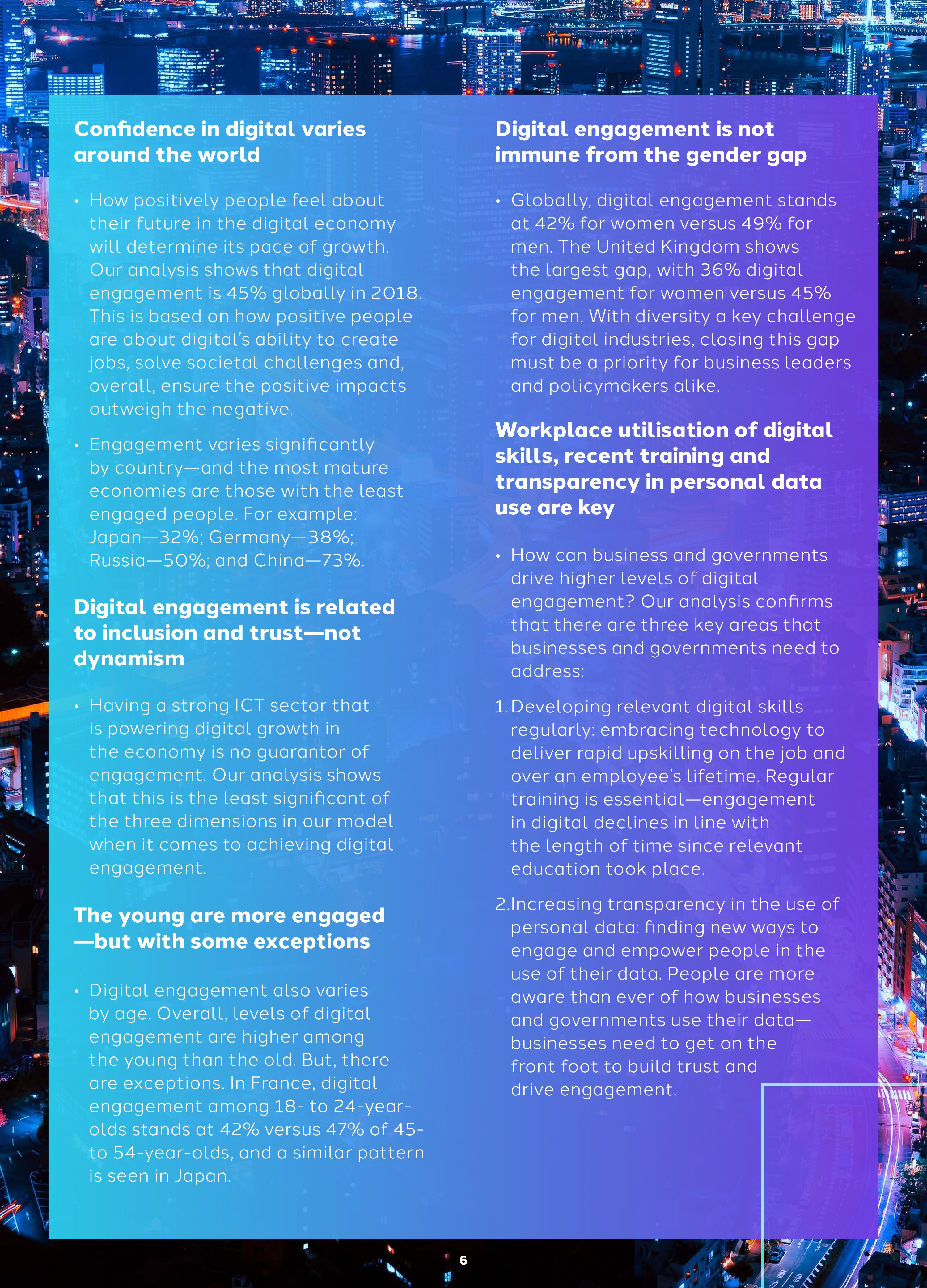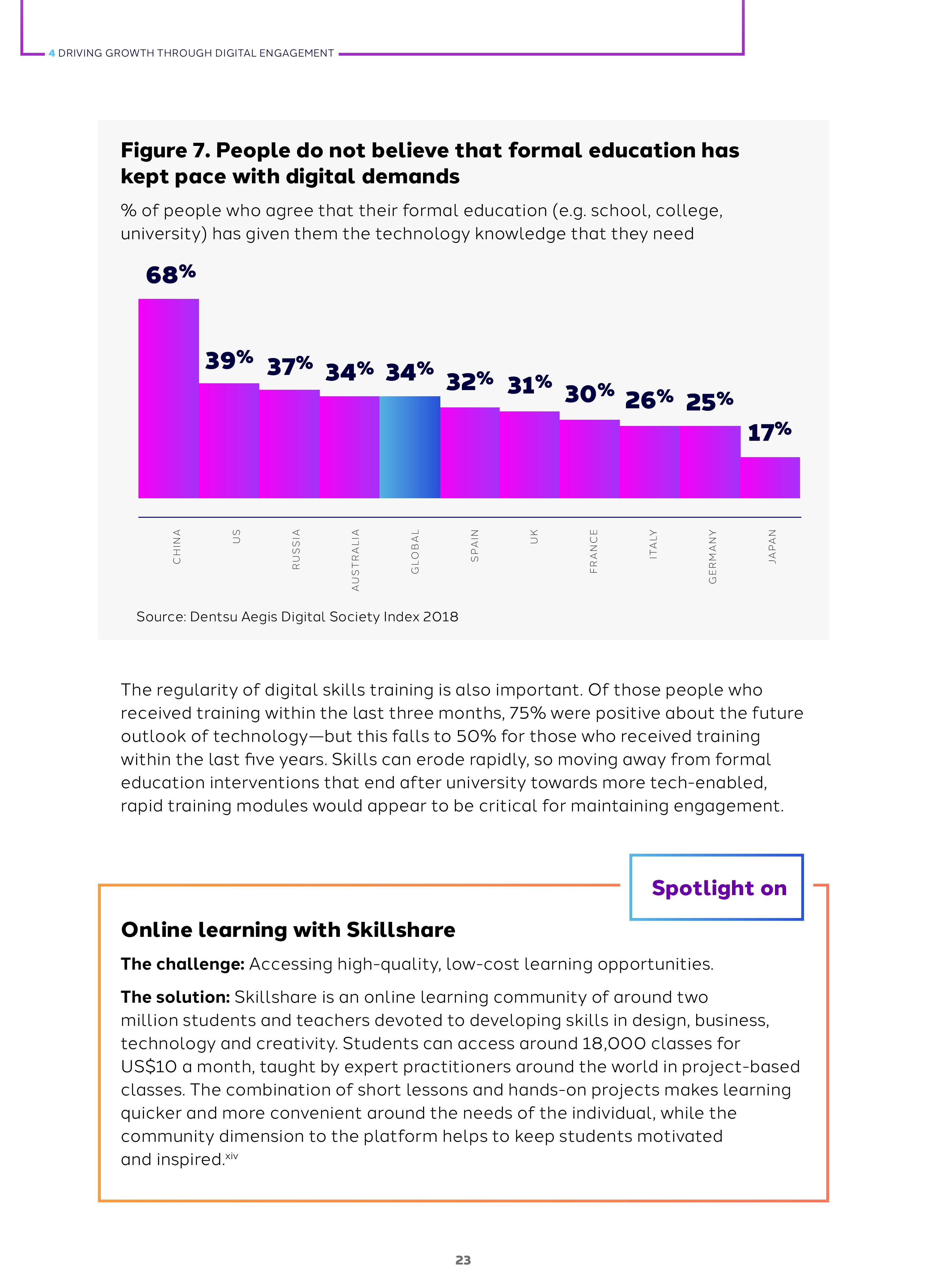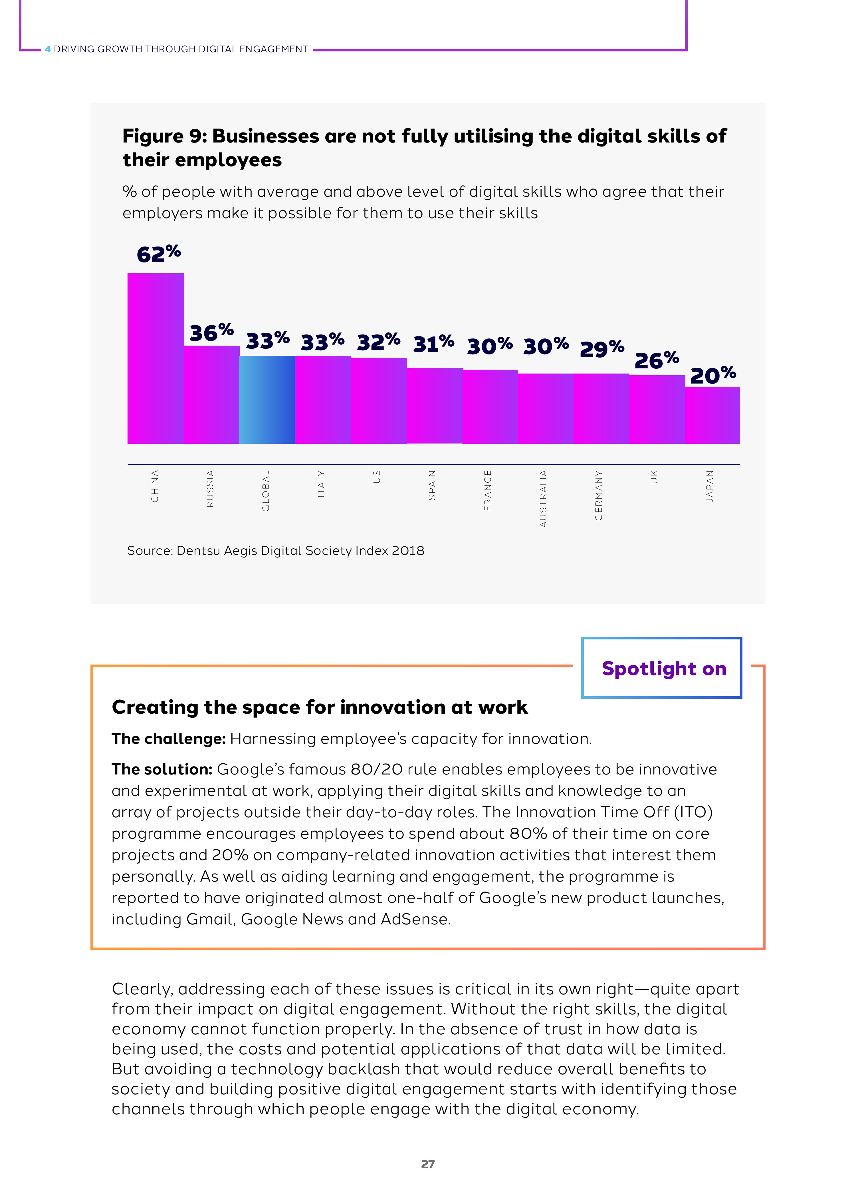2018年全球网络参与度是45%,这是基于人们对网络创造工作、解决社会挑战的积极看法超过负面态度得出的数字。而全球各国的指数差异很大,例如,日本是32%,德国是38%,俄罗斯是50%,中国是73%。网络参与度与包容和信任有关,和活力无关。