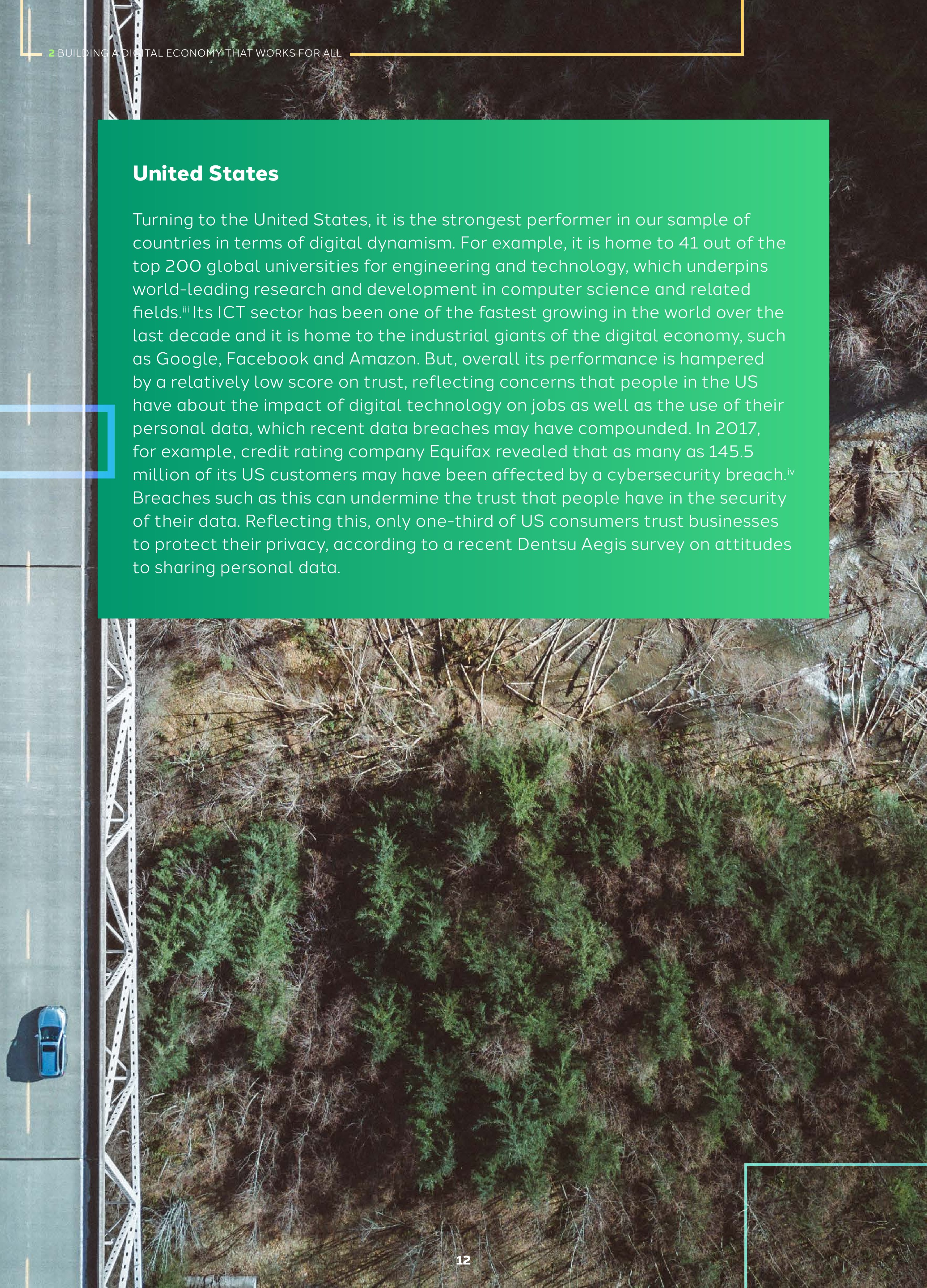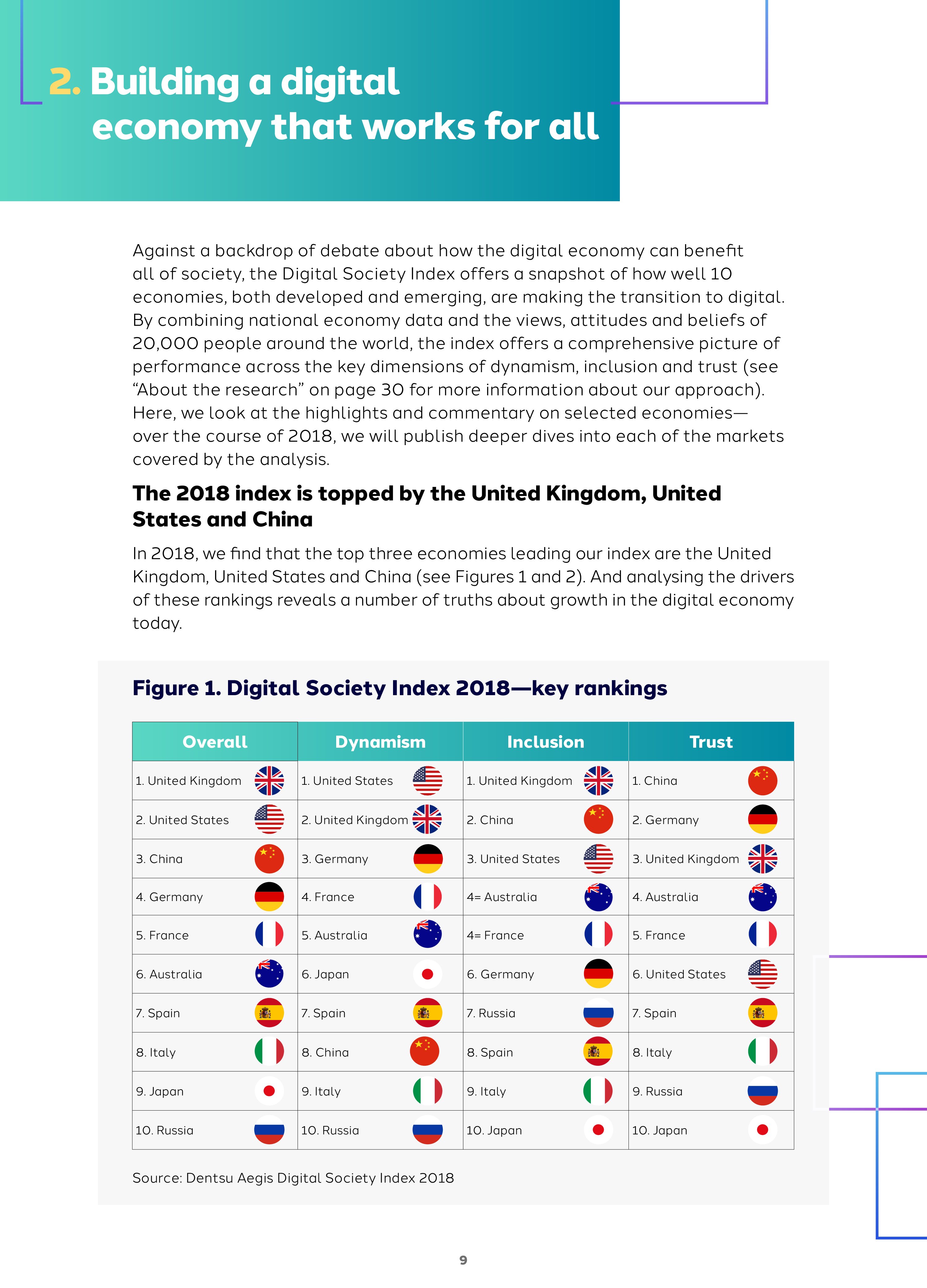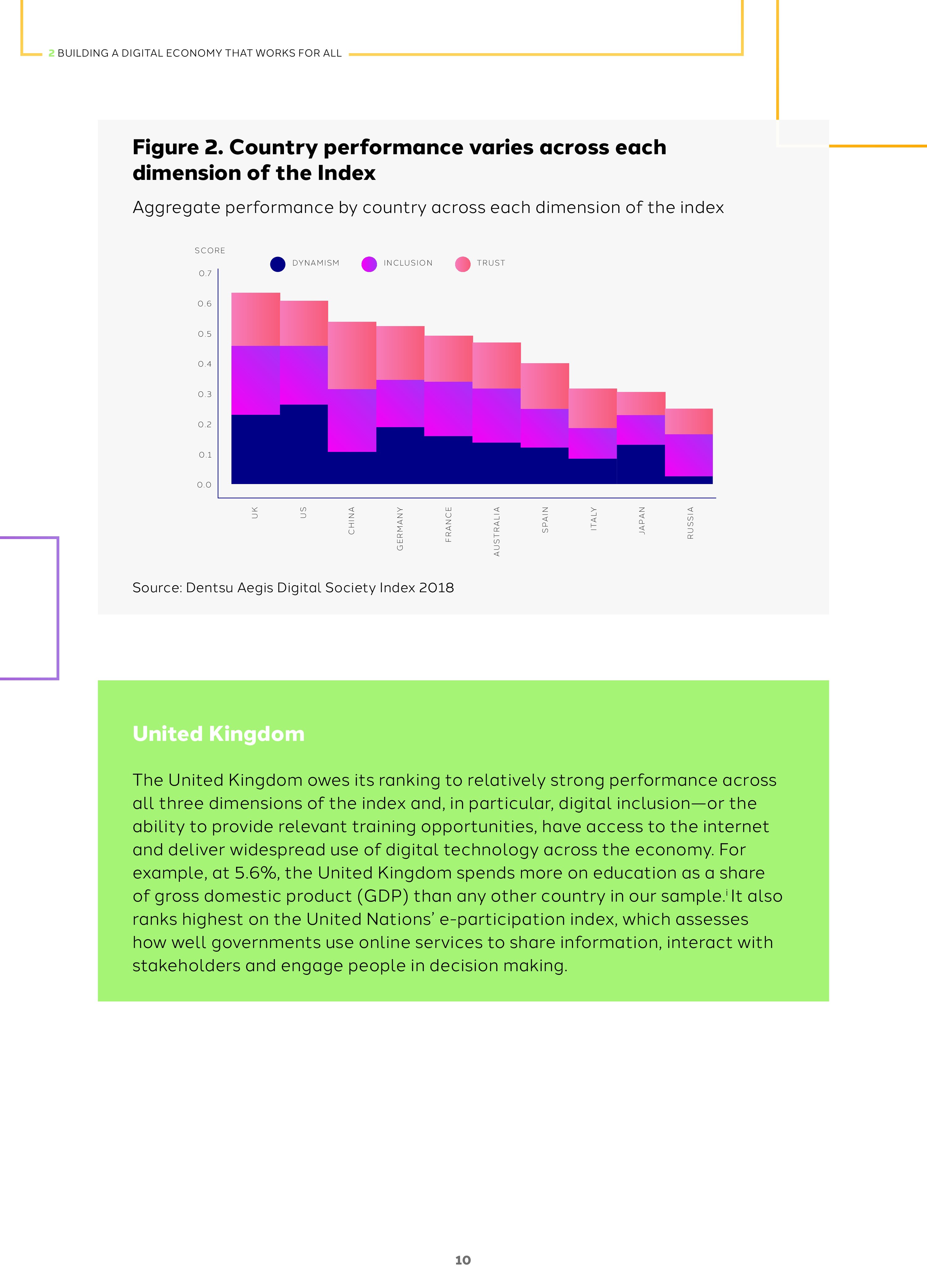 2018年网络社会指数,英国、美国和中国高居榜首,尽管优势和劣势不同。例如,英国在包容性方面更强劲,教育中使用ICT的评价很高,互联网普及率高,网络在经济中应用广泛。美国在活力方面领先,但是对隐私和安全的信任,以及对网络经济未来的乐观态度方面表现不佳。相反,中国虽然在活力方面表现不佳,但是人们对网络经济的未来充满了信任。