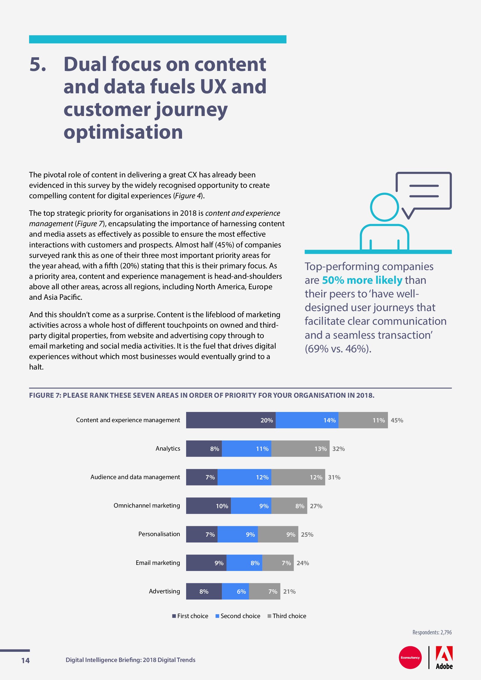2018年企业的首要战略重点是内容和客户体验管理。45%的企业将其列为三个首要事项之一。20%的企业将其作为最重要的事项。