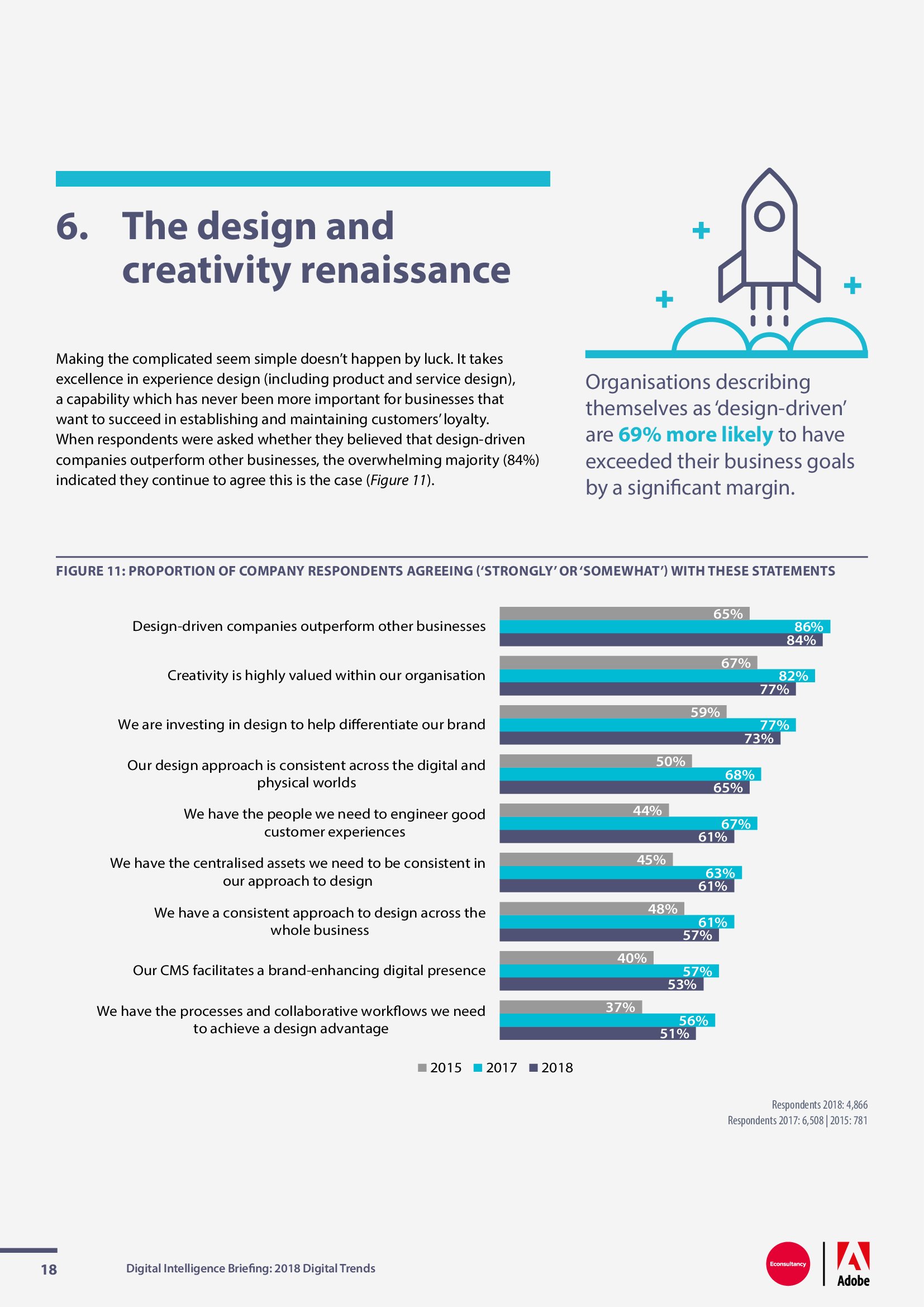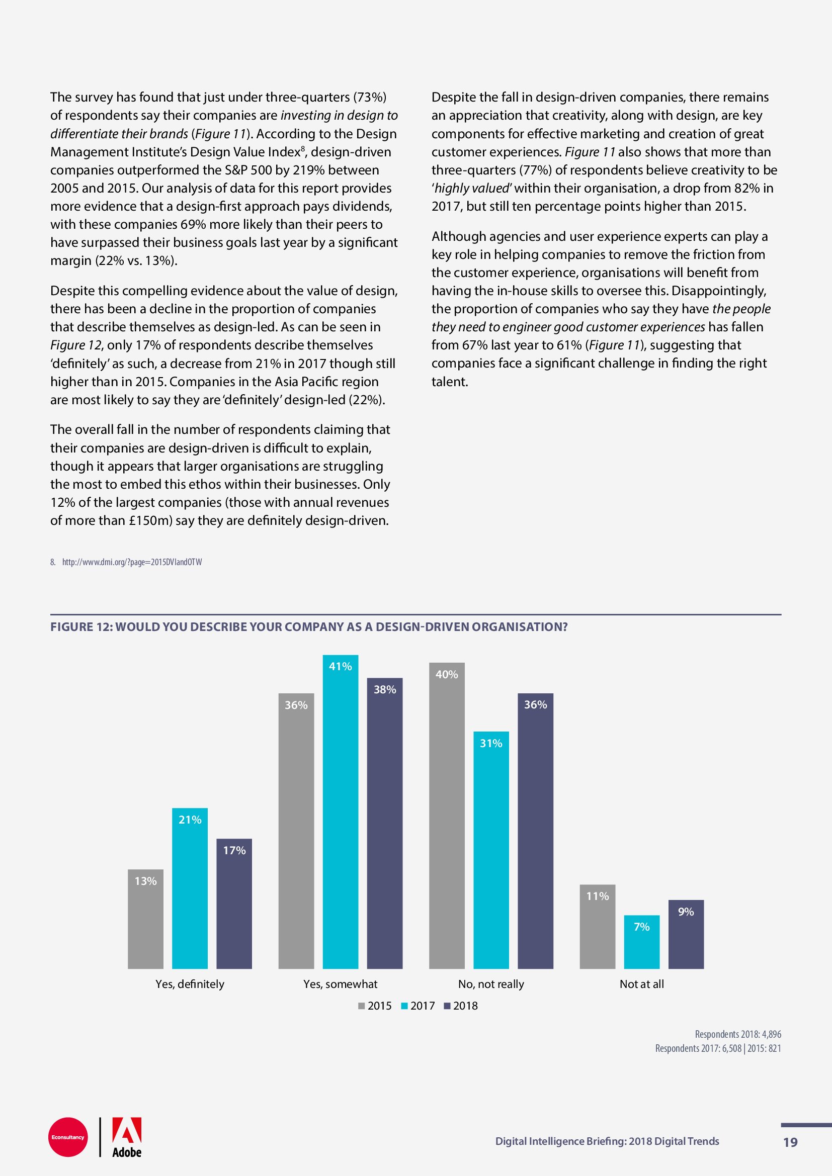 将自己描述为“设计驱动”的企业更可能表示其超过了2017年的业务目标(22% vs. 13%)。