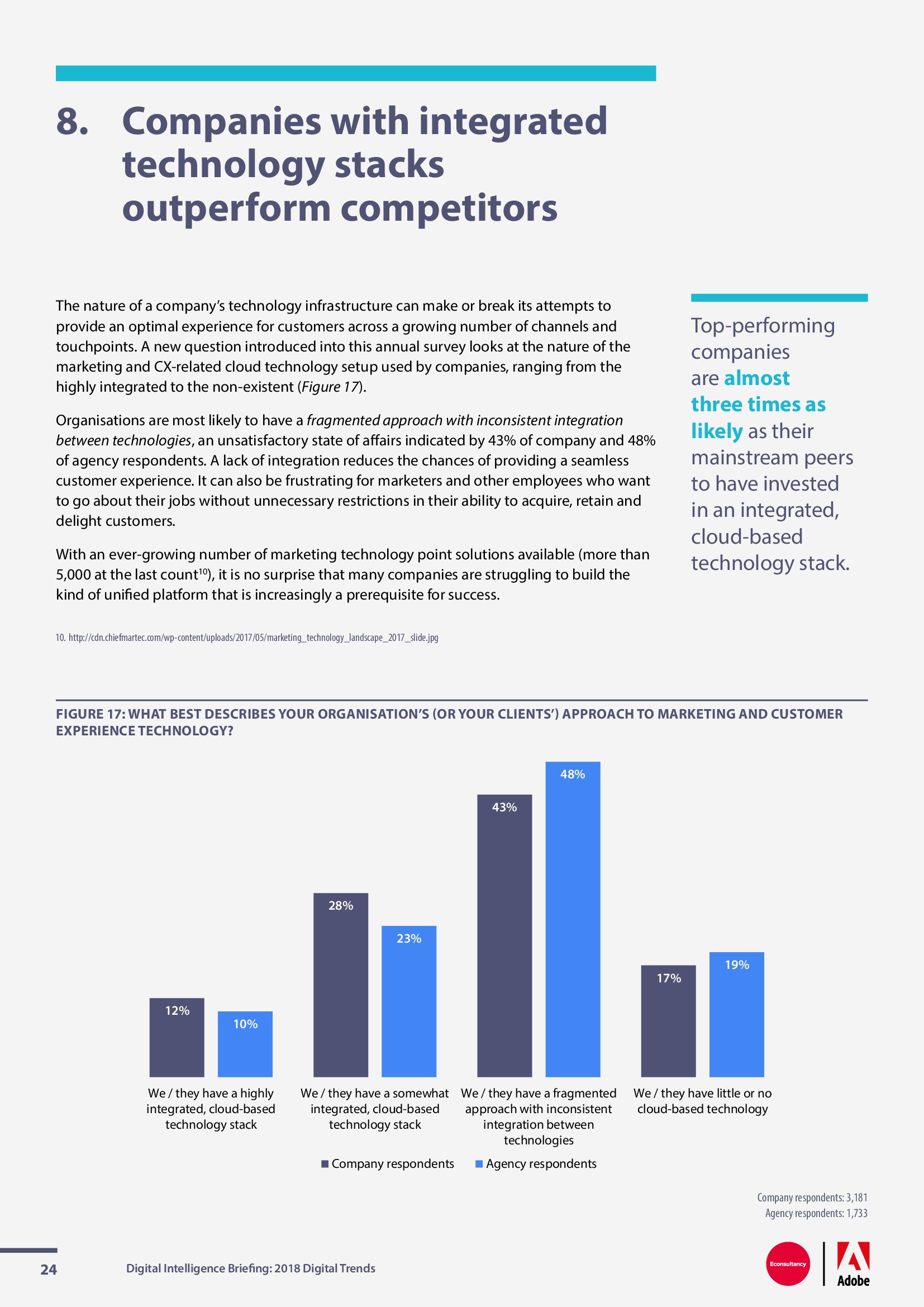 73%的受访者认为他们的企业已经将网络营销与技术进行整合,而他们更可能表示超越了2017年的业务目标(20% vs. 11%)。