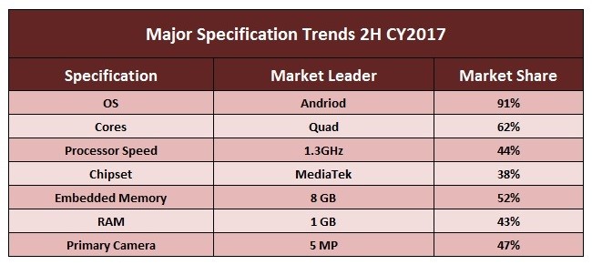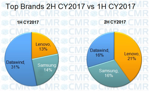 联想的崛起归因于2017年下半年强劲的B2B销售,其在2017年下半年的出货量增长114%。三星电子2017年下半年在印度出货量增长39%,而Datawind的出货量则下滑35%。