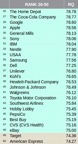 这份年度民调是为了调查美国民众对全美100家最知名企业的感受,最早起始于1999年,此次参与调查的美国民众达到2.58万人。苹果的排名从去年的第5位下滑至第29位,谷歌从去年的第8位下滑至第28位。而在两年前,苹果还曾高居第2位。