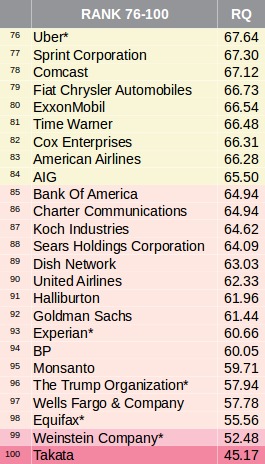 最后看一下榜单末尾,电影制作公司The Weinstein Co排名99位,倒数第二,公司创始人Weinstein正身陷性骚扰丑闻,公司已经申请破产保护。最后一名是日本高田,其气囊产品缺陷已经至少导致22人死亡,数百人受伤,高田及其美国子公司TK Holdings也已经提交破产申请。