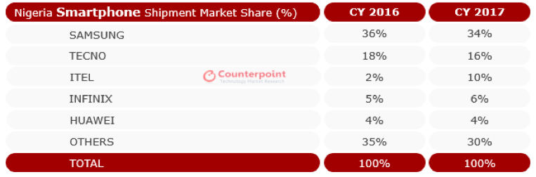 根据科技市场调研机构Counterpoint指出,由于近日尼日利亚经济衰退,很大程度影响了智能手机市场,使得消费者转向功能手机,而功能手机市场更是在这一年达到年增长率15%的成绩。在2017年,尼日利亚整体手机市场的增长仅为6%。由于经济放缓,原本占52%手机总销量的智能手机市场同比下降了1%。在出货量方面,三星则以34%的份额引领了整个智能手机市场。
