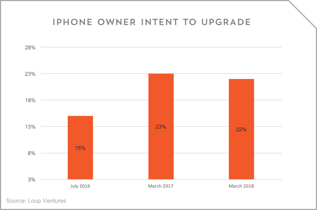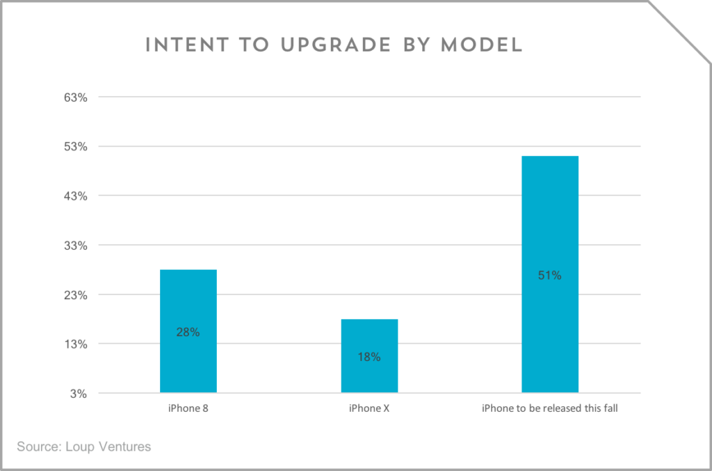 调查来自研究公司Loup Ventures,其对511个美国人进行了问卷调查。在调查问卷中,约226名受访者中是iPhone用户,其中22%称将升级到将于2018年秋季发布的新iPhone。据Loup Ventures称,2017年用户想要升级到iPhone X的比例为23%,2016年想升级到iPhone 7的比例为15%。