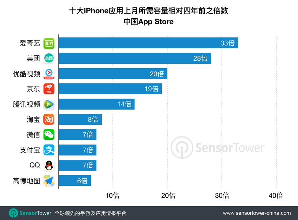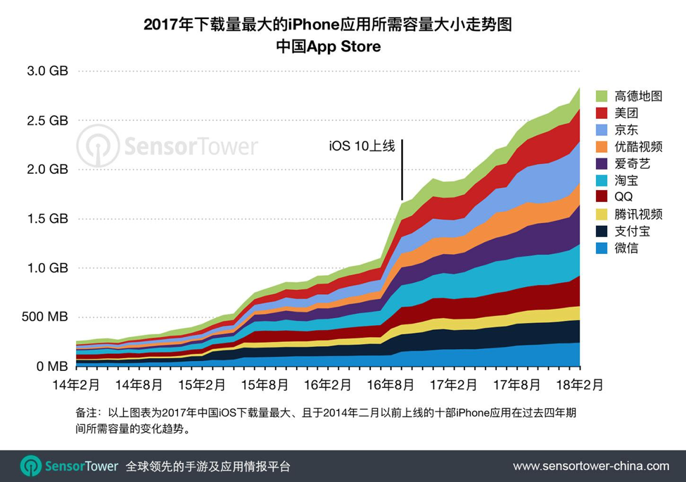 有没有注意到你的iPhone近几个月更频繁地提示你手机内存不够了?你的苹果手机里除了照片、录像、iMessage等所占空间极大以外,App其实也在不断扩大体积。Sensor Tower应用平台App Intelligence最新数据揭示,2017年间全国iPhone用户下载最多、并在2014年二月以前上线的10款App所需容量从四年前的260MB上升到今年二月的2.84GB,涨幅达992%。哪些App体积增幅最大?手游App的扩张是否存在相似的形式?我们在接下来的分析中一一揭晓。