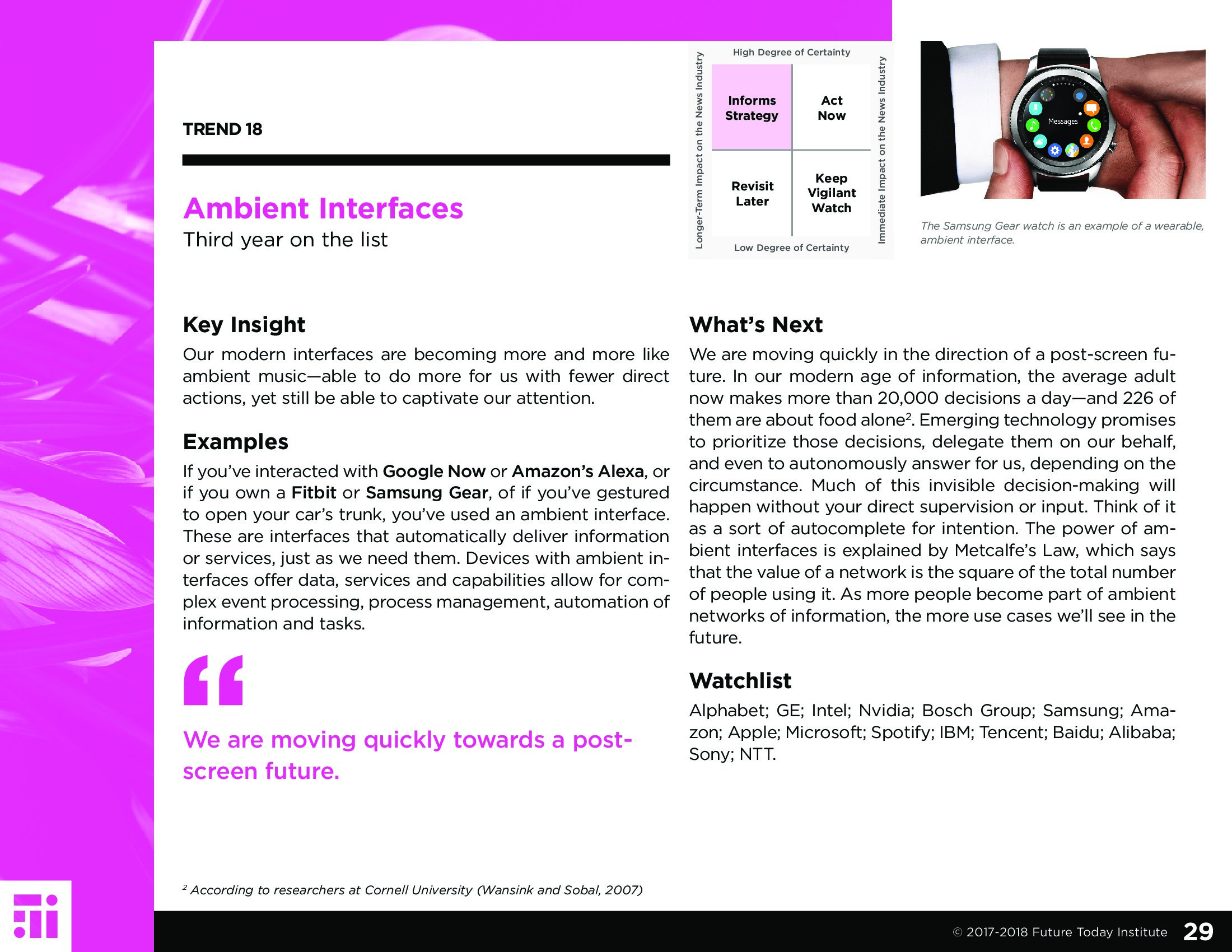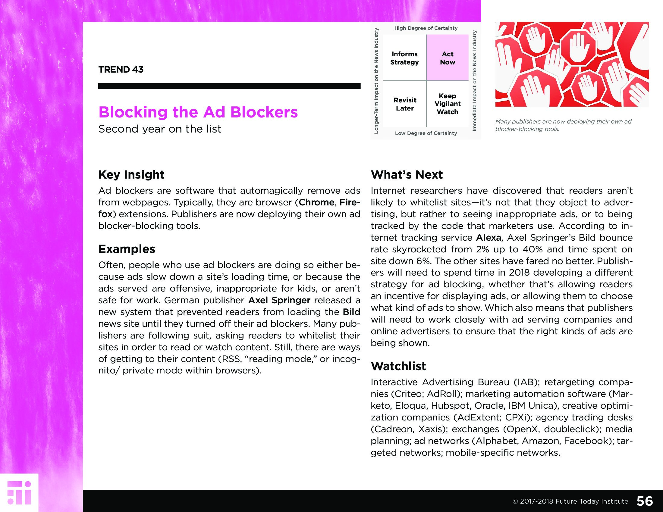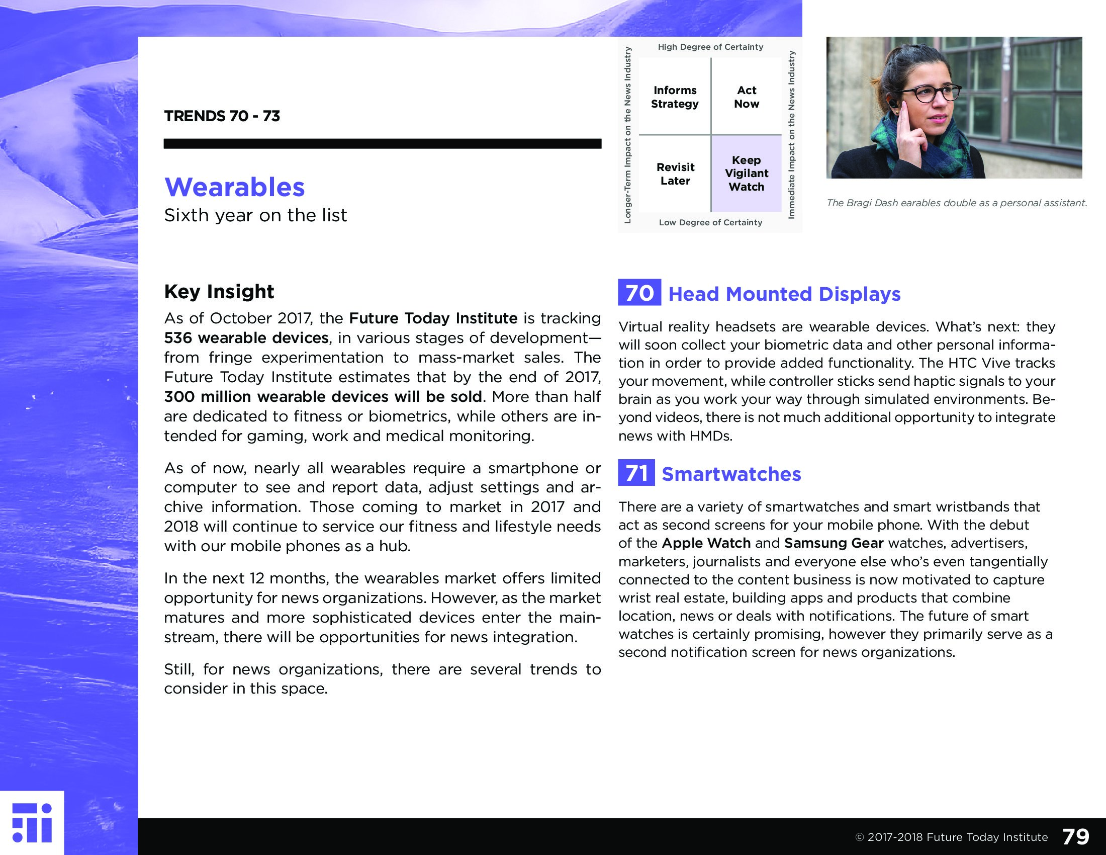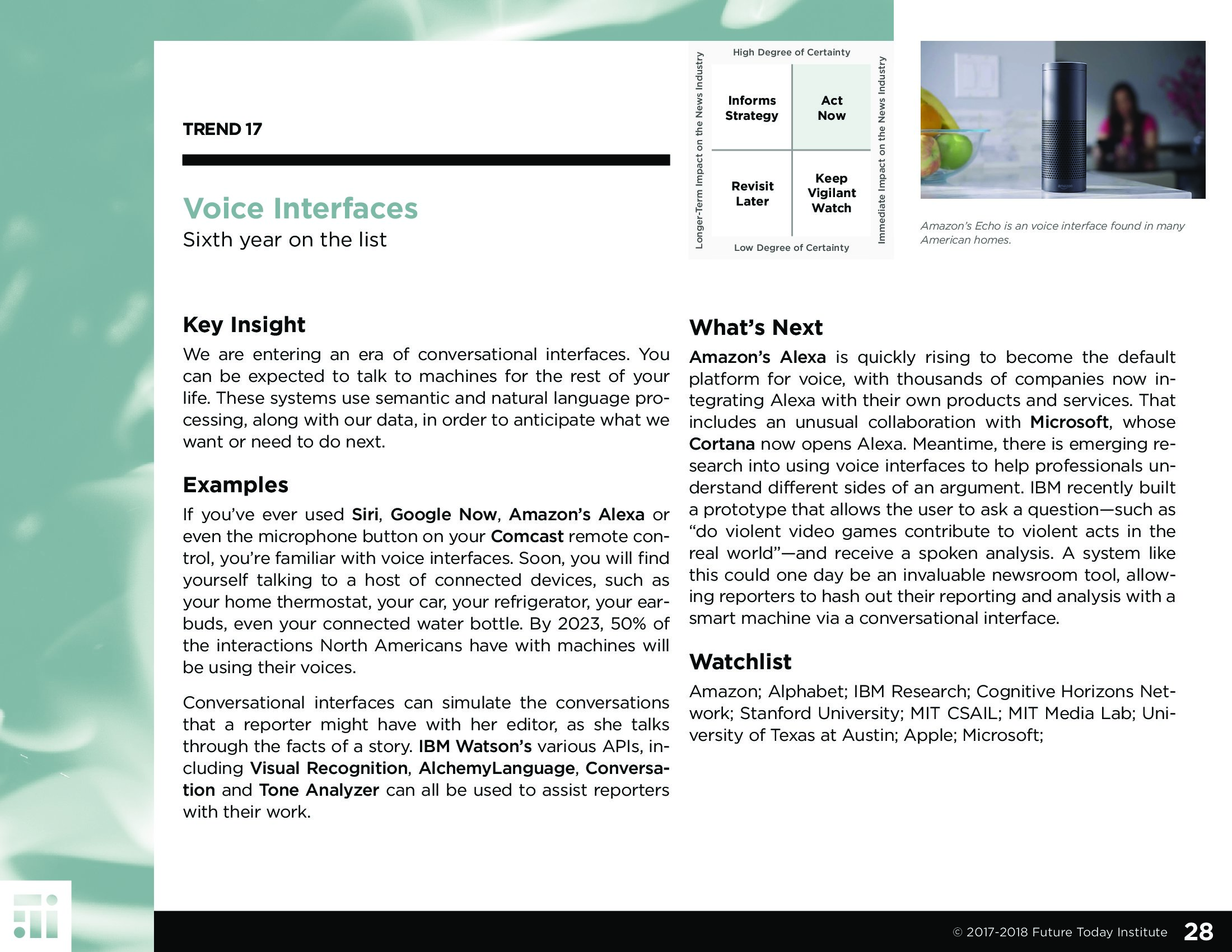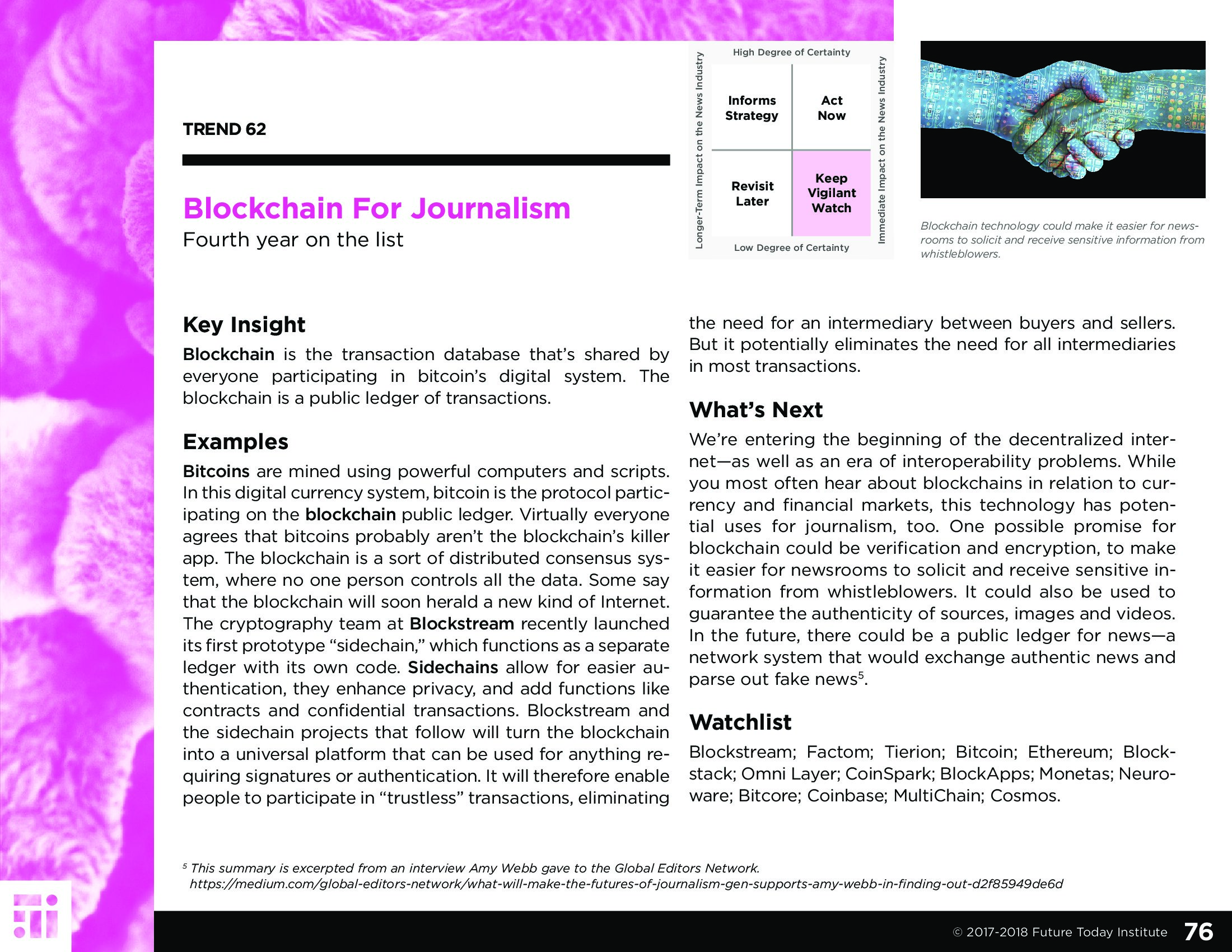 2018年将有大量新兴科技开始进入应用阶段,摆脱测试和应用实验阶段,这是一个值得关注的趋势。新闻机构应当关注的新趋势包括,区块链、语音界面、内容去中心化、混合现实(MX)、新型搜索以及智能硬件等。