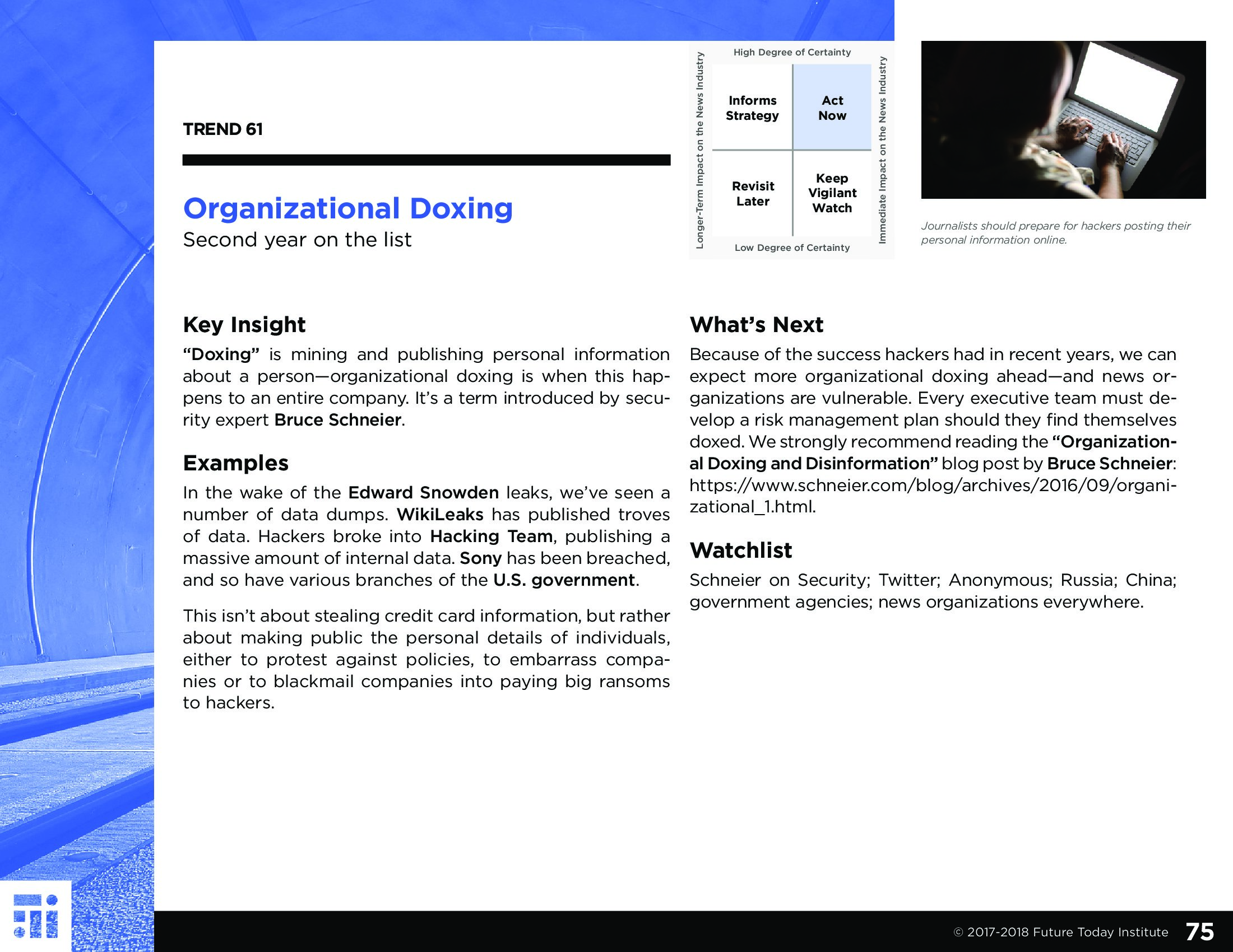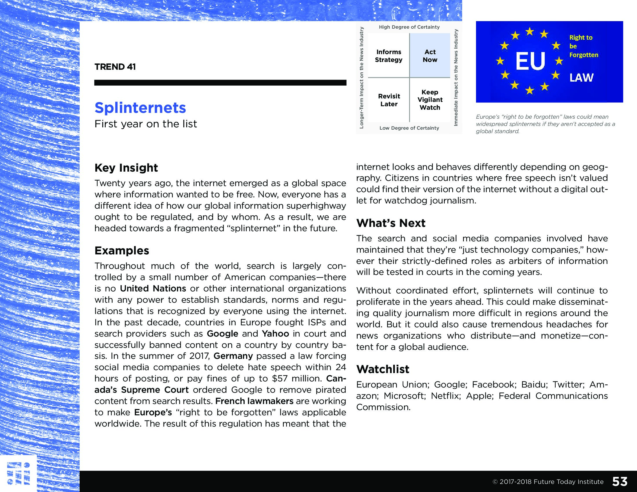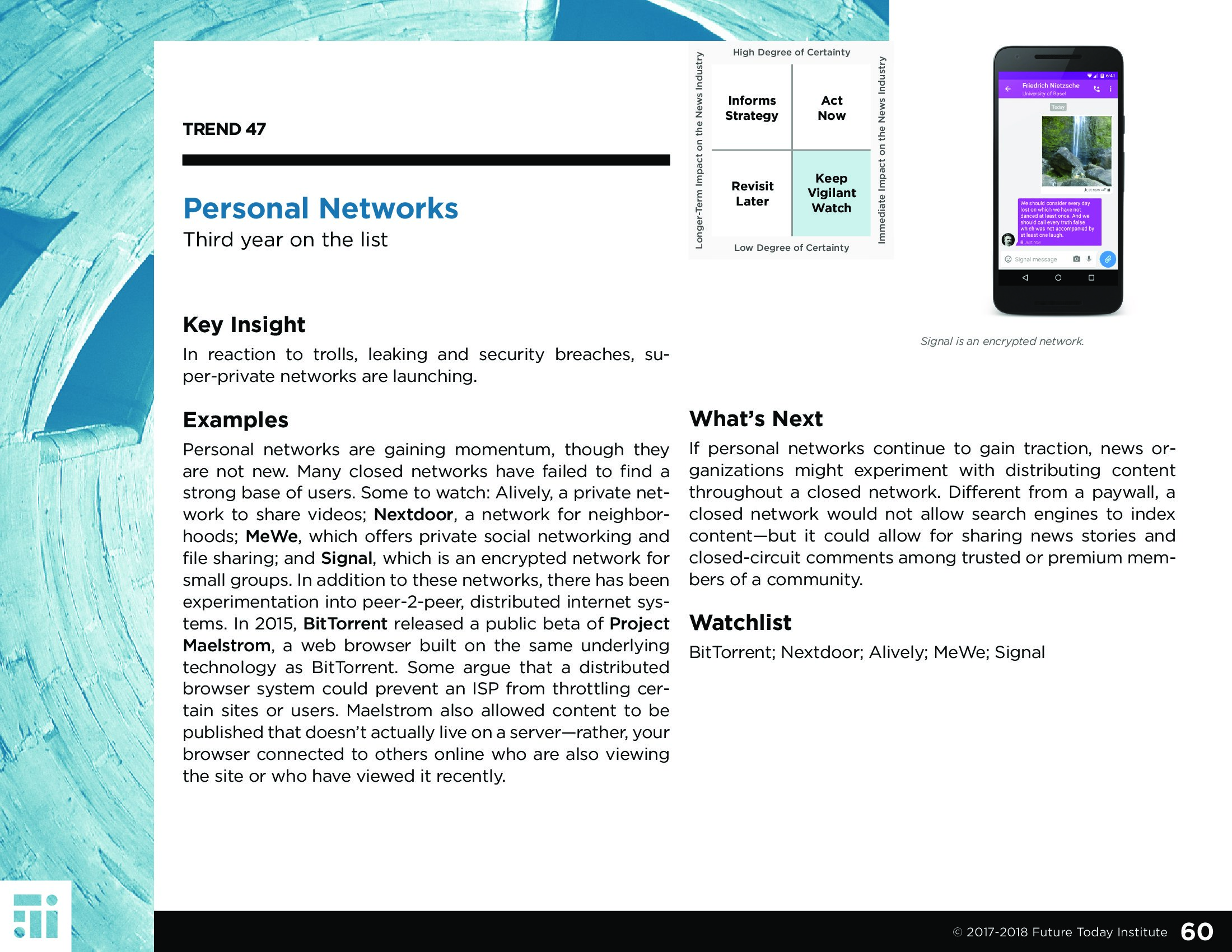 去中心化成为2018年的一个关键主题。在与FTI合作的企业和组织中,一个新趋势是限制端对端的网络(peer-to-peer networks),这样的网络可检测到骚扰、共享资源,并将记者和资源联系起来。一些民主国家的政府也在细分网络接入,并限制某些内容,因此制造出一些“分裂网络”。
