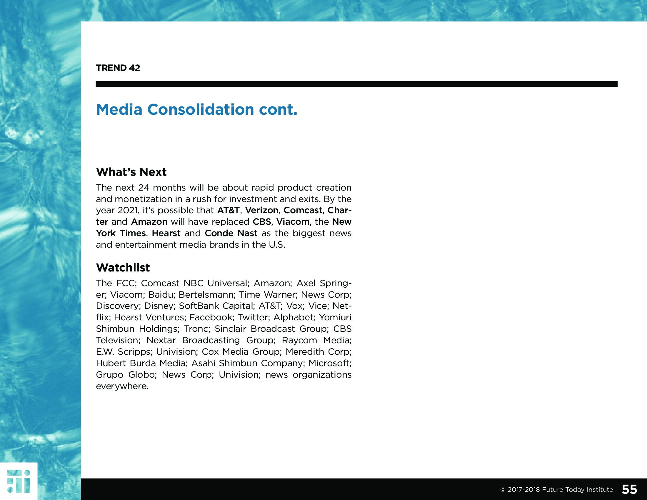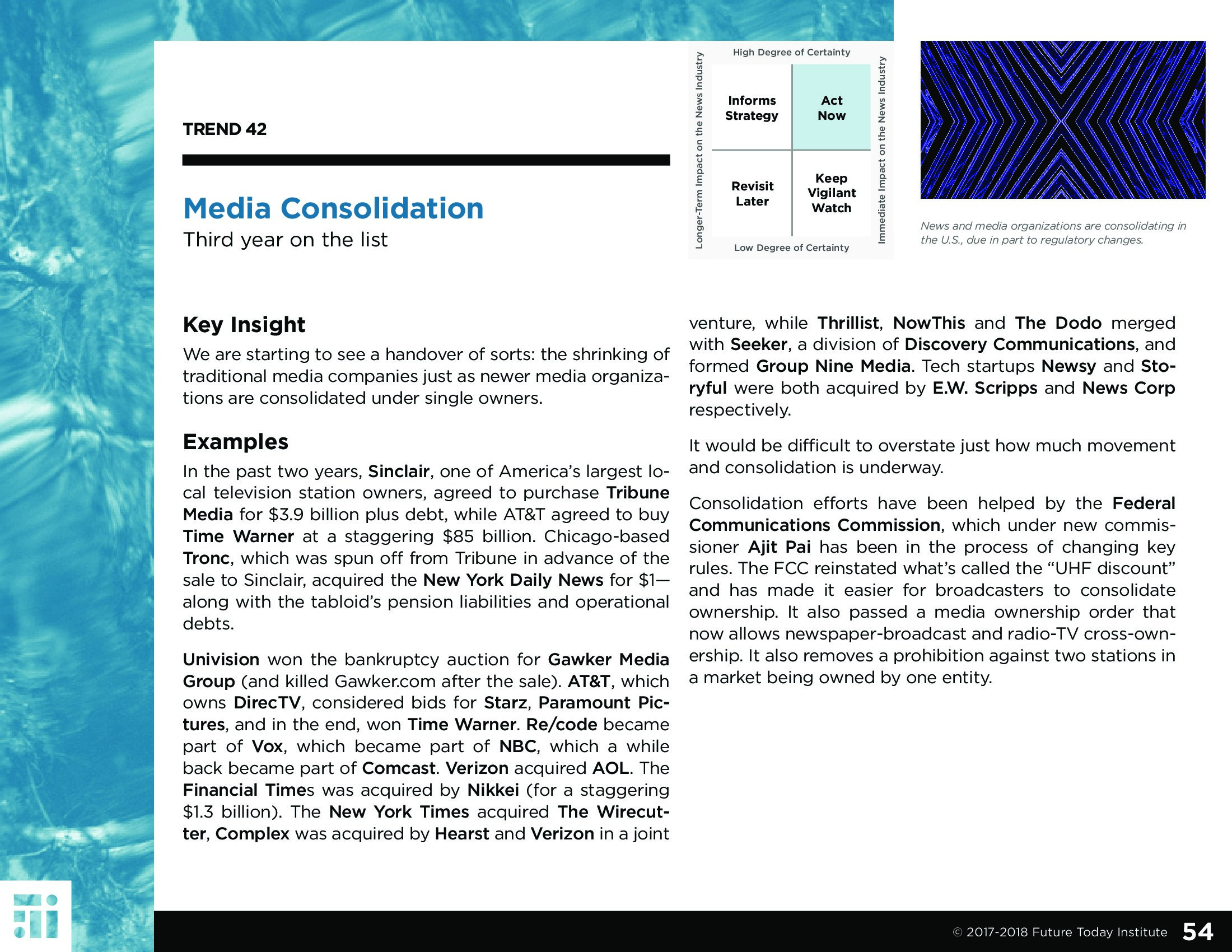 合并也是2018年新闻行业的一个关键主题。新闻品牌、广播和人工智能初创企业将继续携手,并被少数大型企业收购。美国、欧洲和亚洲部分地区在未来一年里通过立法和发布政策进一步加强新闻行业的合作,特别是与信息和技术企业。