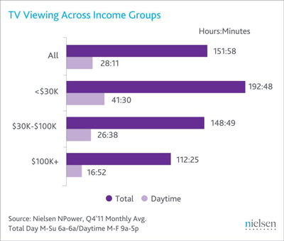 收入水平影响媒体购买和内容的获取方式。高收入群体在获取各种设备和媒体类型上比较独特。低收入用户在媒体消费上也存在自己的特点。每月平均每个美国人在电视上的时间为151小时58分钟。低收入的用户对媒体的需求更强,每天比中等收入的人群在电视上的时间要高15%,比高收入人群高25%。要到达不同的收入群体,广告主需要了解他们的媒体行为差异