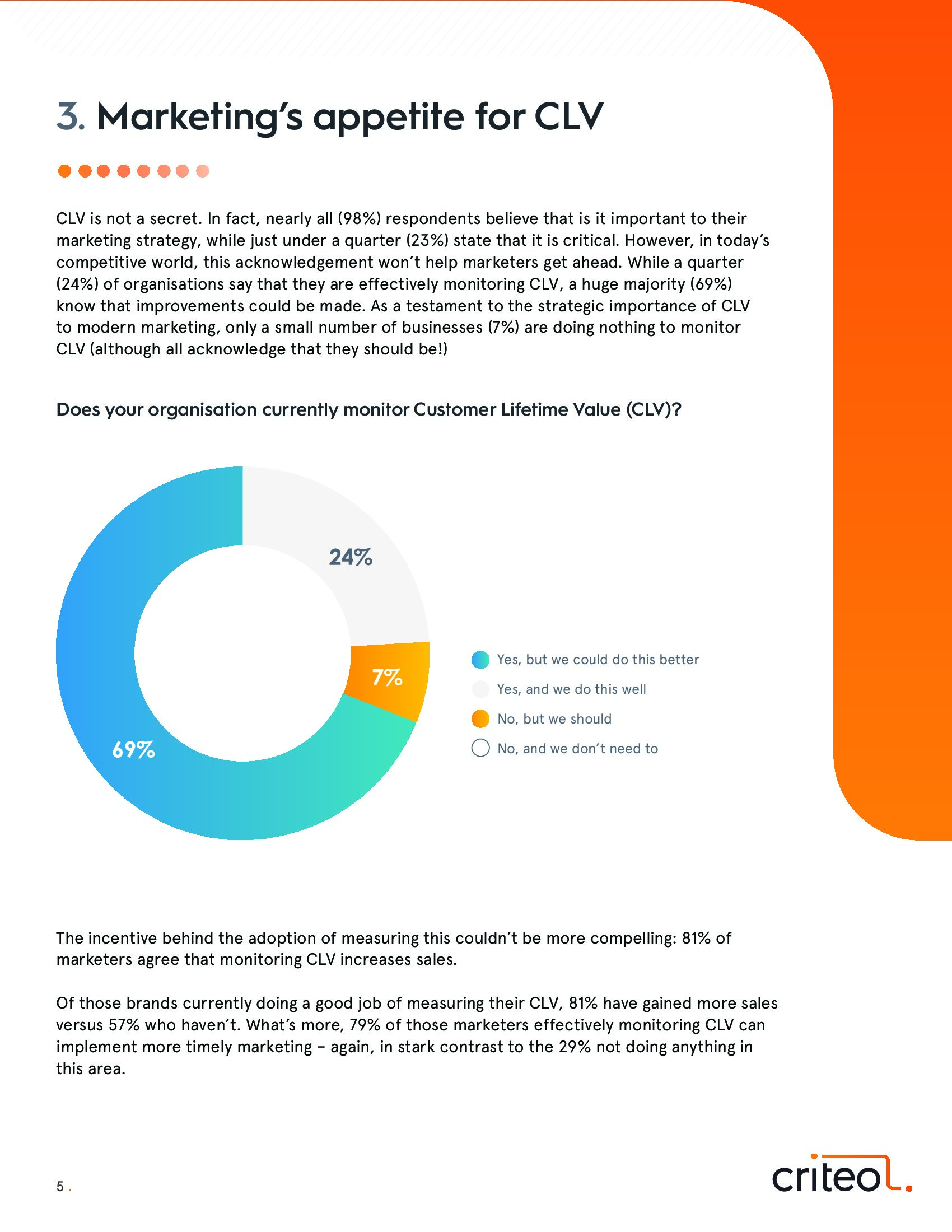 报告显示,100%的受访营销人员知道“顾客终身价值”(CLV),其中超过1/3完全了解该术语及其内涵(34%)。但是,在实施这方面营销时也会出现挑战。93%的企业正在测量CLV,其中69%认为他们可以做得更好。