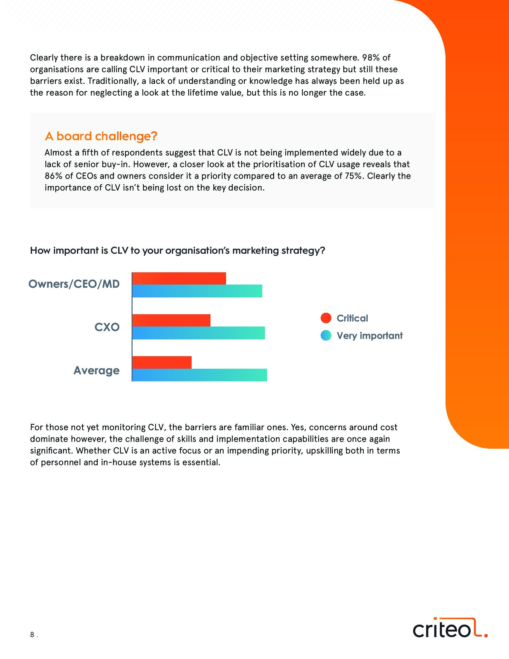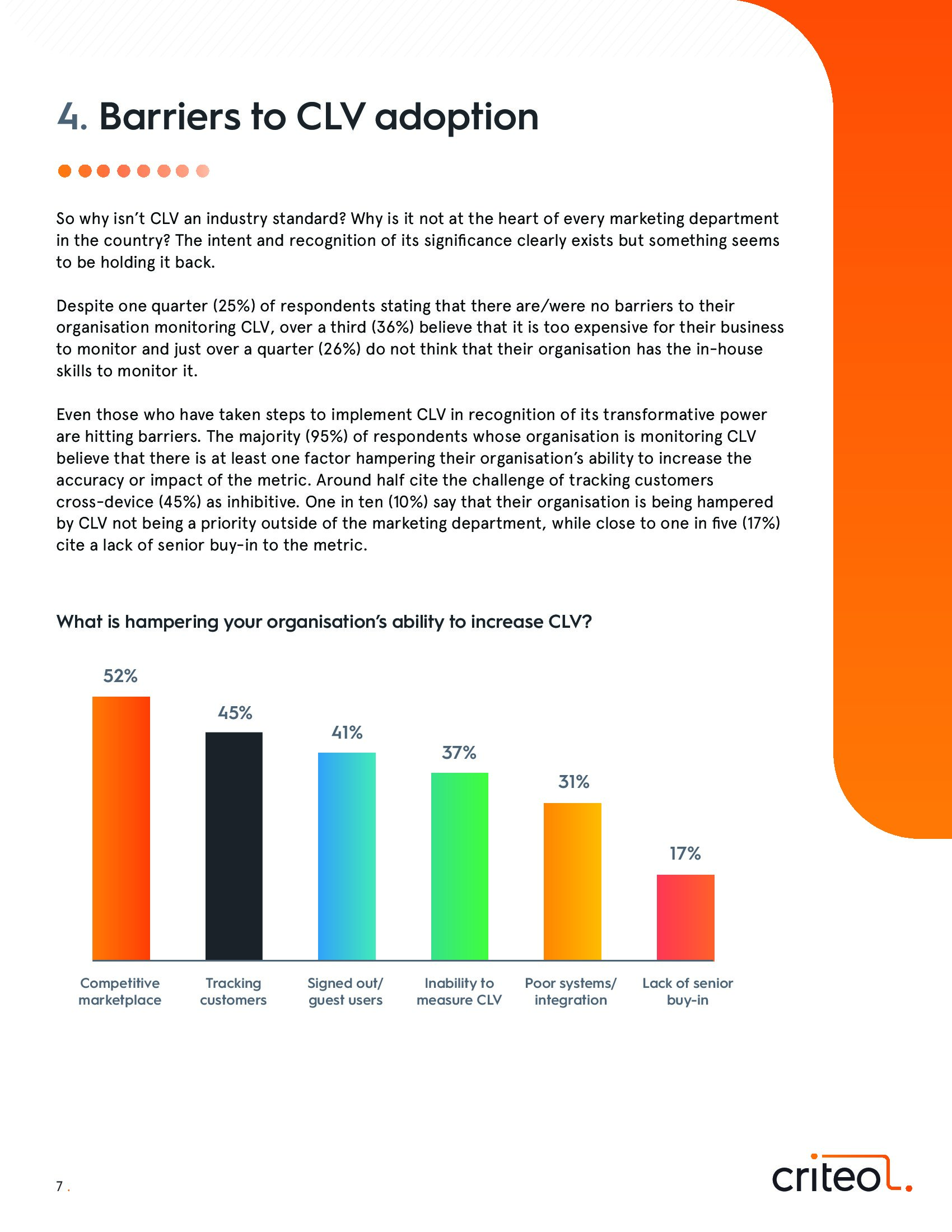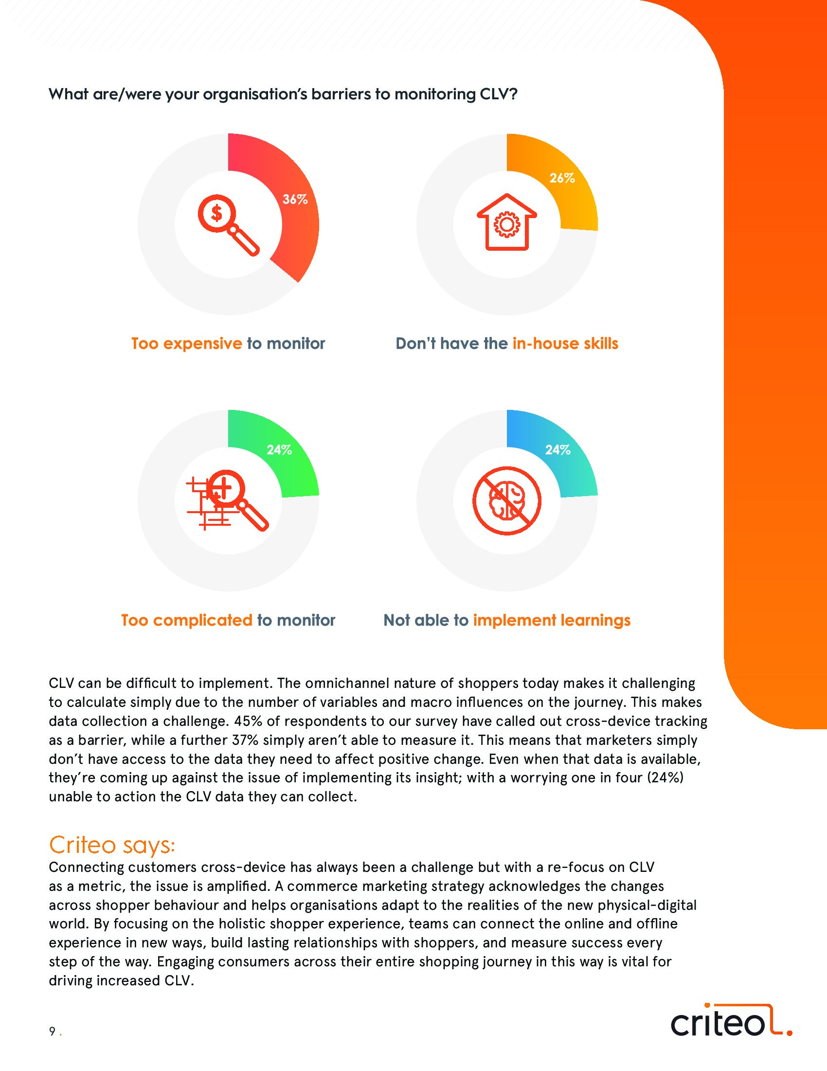 调查还发现,全渠道时代和企业孤岛进一步阻碍了追踪和实施CLV的发展。