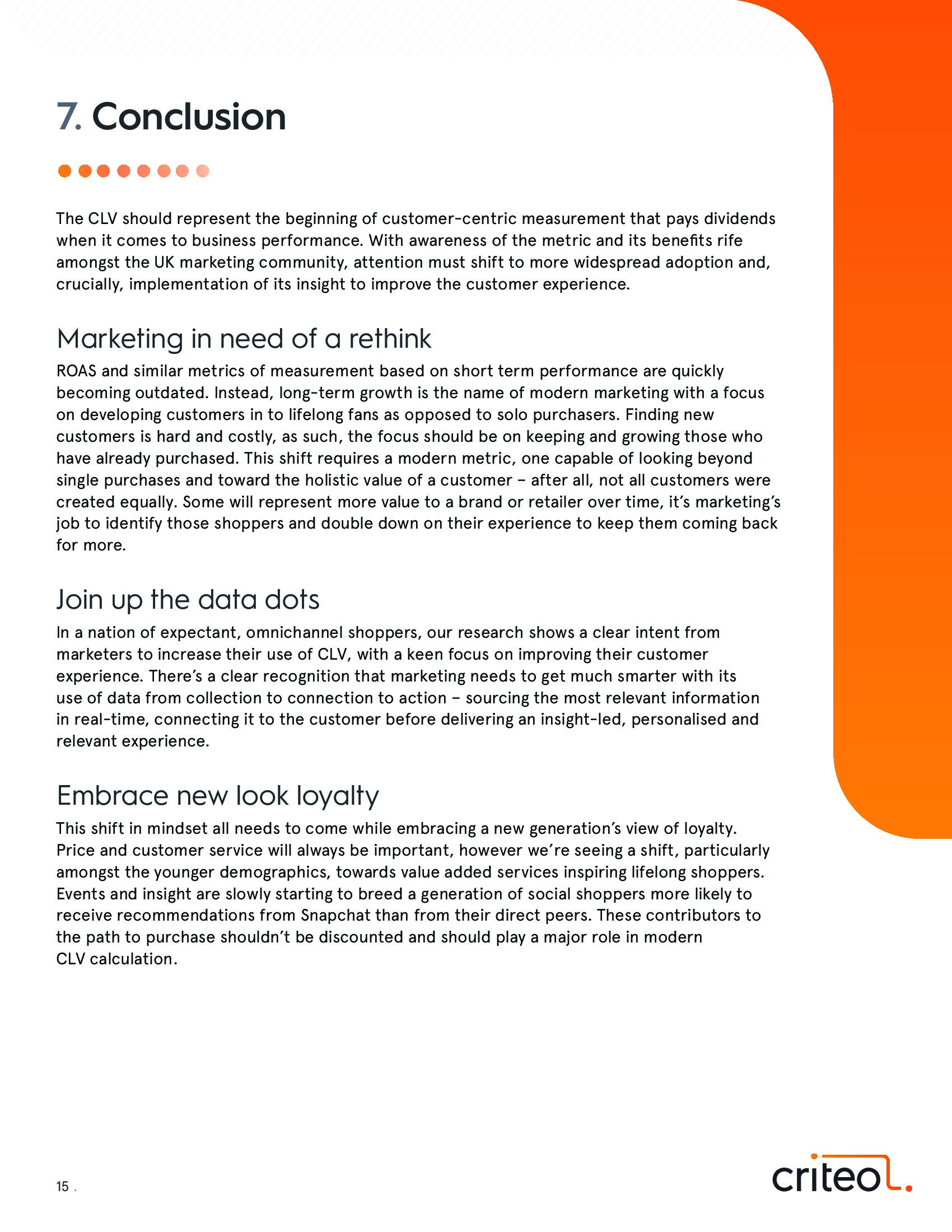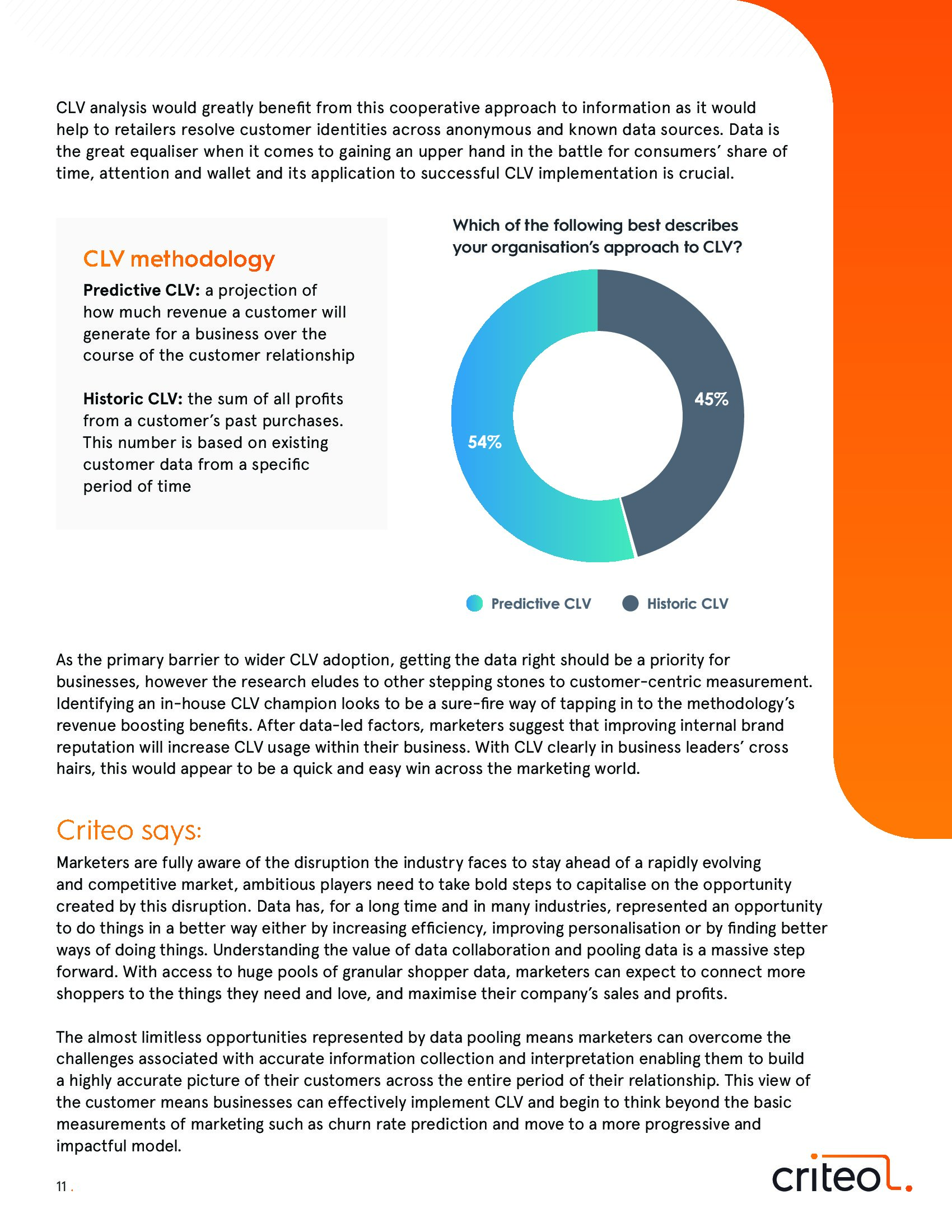 营销人员正在接受这一挑战,不再依赖基于广告支出投资回报来测量成功,而是关注长期的、整个企业的增长。实现这一目标的关键战略重点是实施向CLV的转变。随着企业更容易获得和处理第一方数据,创建动态的CLV变得更可行。没有CLV的观念才是真正的挑战。