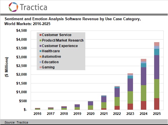根据Tractica的最新数据,这些趋势正在推动情绪分析软件市场的崛起。2017年全球情绪分析软件收入1.23亿美元,到2025年这个数字将增长至38亿美元。这一增长主要受到零售、广告、商业服务、医疗保健和赌博等行业的推动。