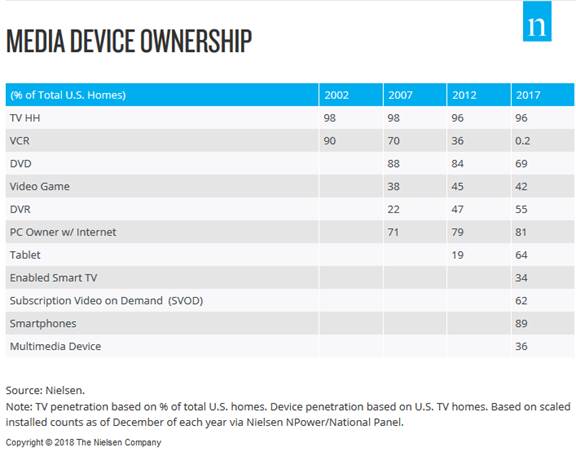 96%的美国家庭有电视,其他设备也越来越普遍。PC的普及率放缓,但是82%的美国家庭有电脑。平板和智能手机的普及率快速增长至64%和89%。订阅视频点播服务(SVOD)已经超过了DVR。2/3的美国家庭有支持电视播放视频流的联网设备,包括智能电视,多媒体设备和视频游戏主机。