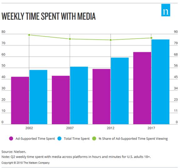根据尼尔森的数据,2017年成年人在电视、广播、智能手机、游戏机和平板电脑上收看的内容中,广告支持的占86%,这个指数在过去十年几乎没有改变。2002年广告支持的内容占89%。