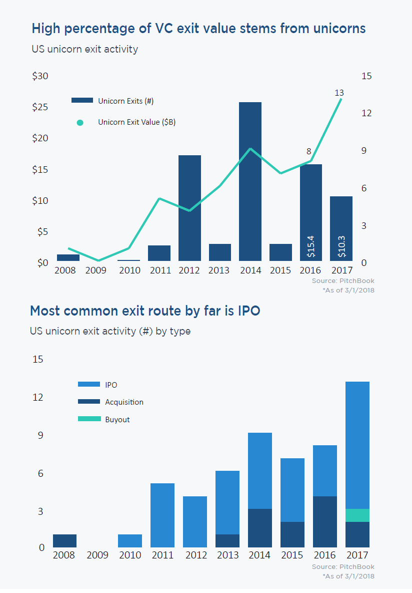 随着Dropbox和Spotify(欧洲独角兽)已在2018年申请公开上市,预计今年可以看到更多独角兽投资退出。总体而言,独角兽集团正在老化,至少在VC方面。 2017年获得新一轮投资的独角兽平均年龄超过八年。从商业周期来看,老年独角兽越早退出越好。