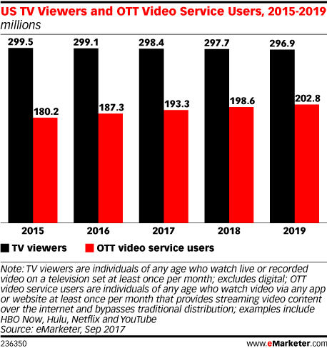 eMarketer高级预测总监Monica Peart表示:“观众转向收看OTT正在改变电视广告市场的气氛。随着电视节目收视率持续下滑,广告商的支出也将继续下降,特别是在那些没有总统选举和奥运会等重大事件的年份。”