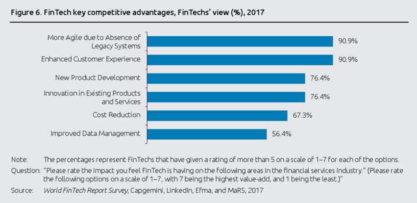金融科技公司与传统金融机构拥有各自不同的优势。新兴的金融科技公司在灵活性(90.9%),用户体验(90.9%),新产品开发(76.4%),现有产品和服务的创新能力(76.4%),成本节省(67.3%),提升数据管理等方面具有明显竞争优势。