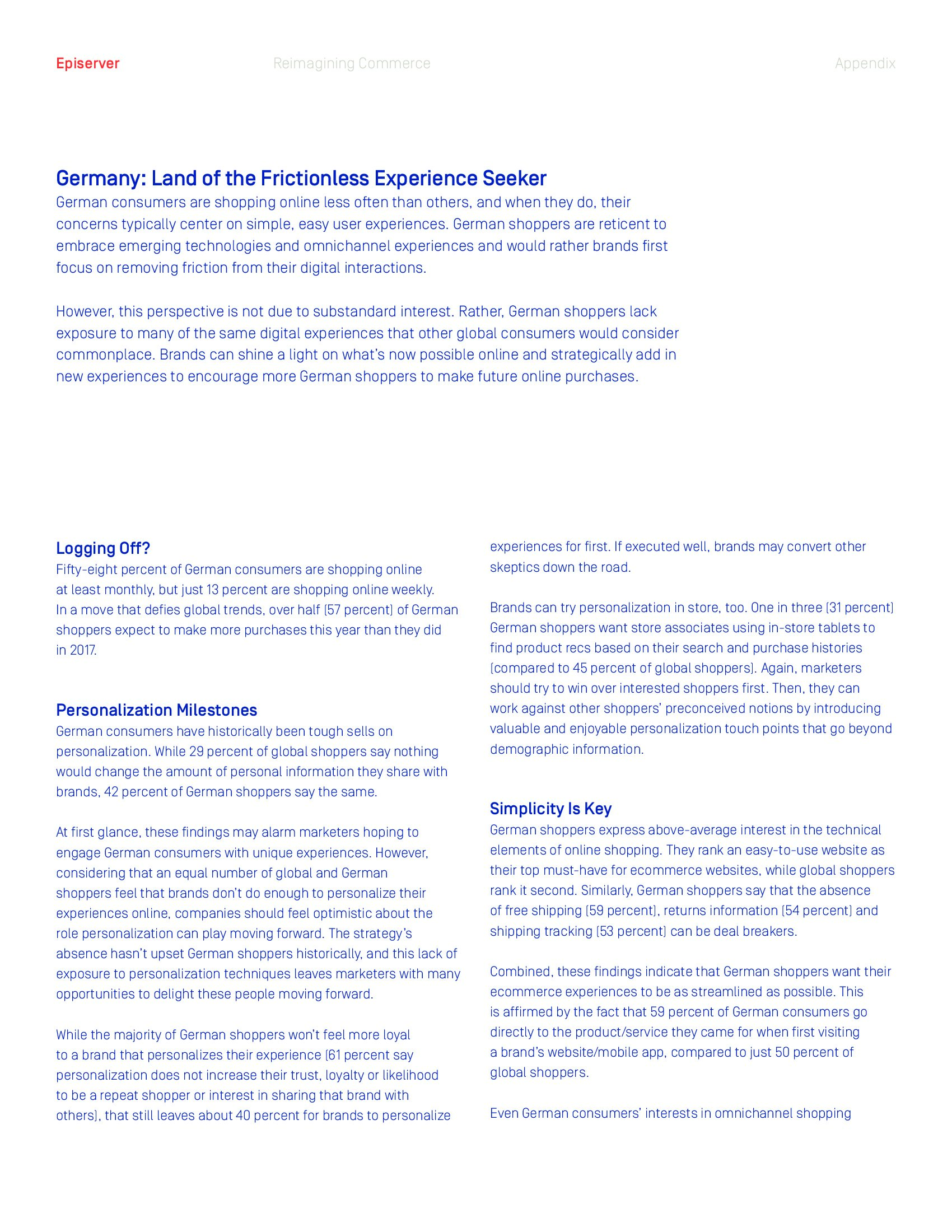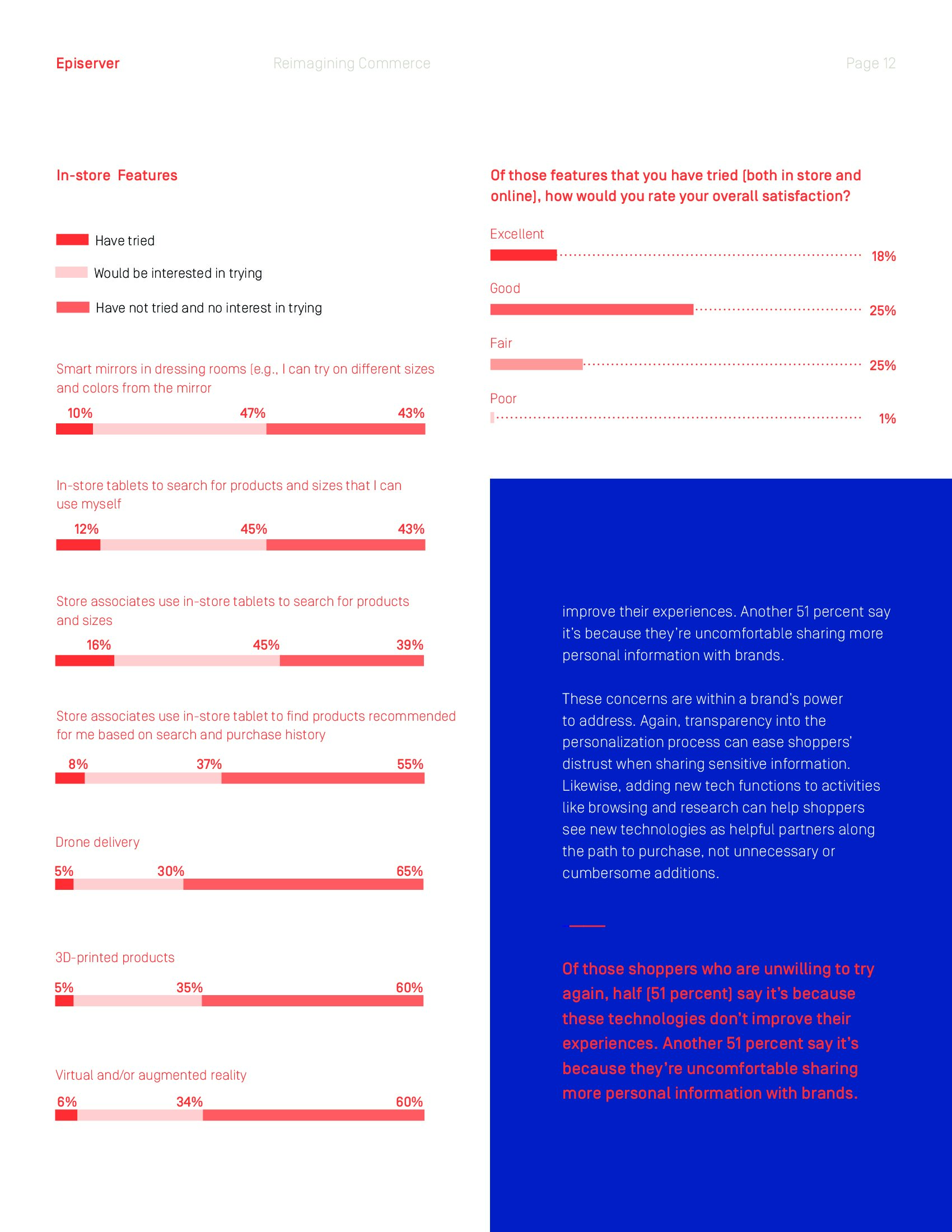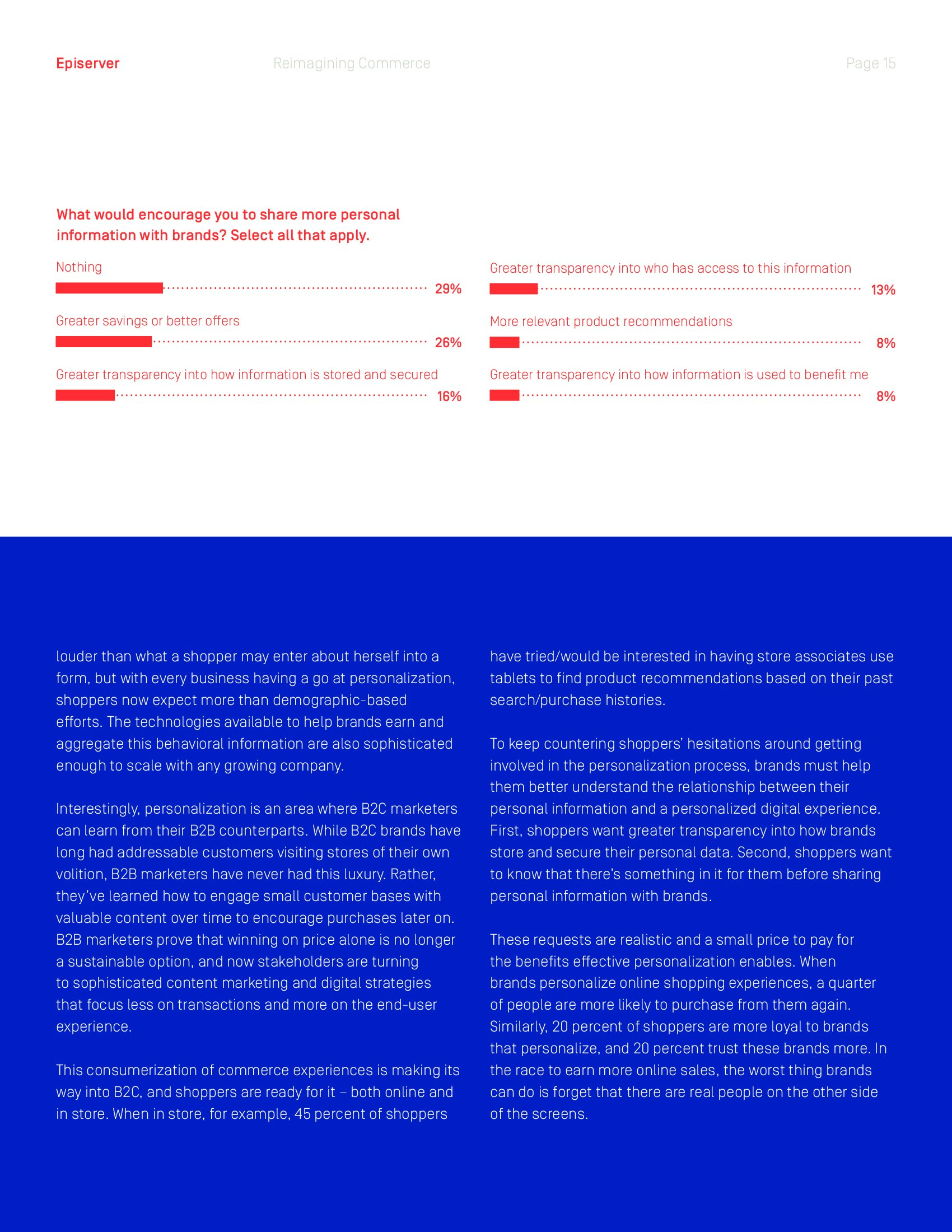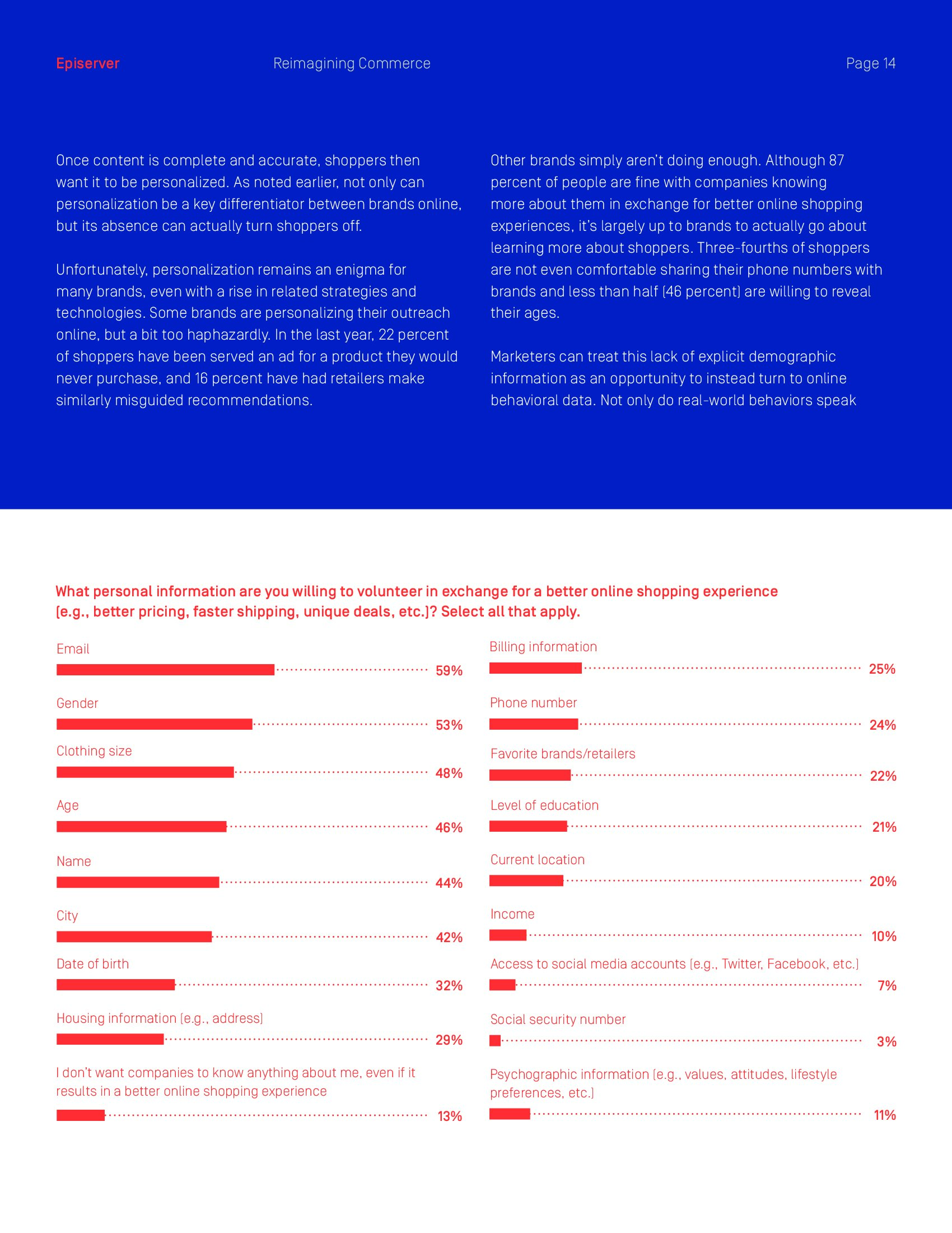 Episerver调查了美国、英国、德国和北欧地区的4000多名购物者,并发布了最新报告“重塑电子商务:体验驱动”。大多数网络购物者会轻松地提供他们的电子邮件(59%)和性别(53%)以获得更好的网络购物体验,但他们很大程度上回避了共享许多其他数据类型,包括地址(29%)和当前位置(20%)、心理信息(11%)和收入(10%)。