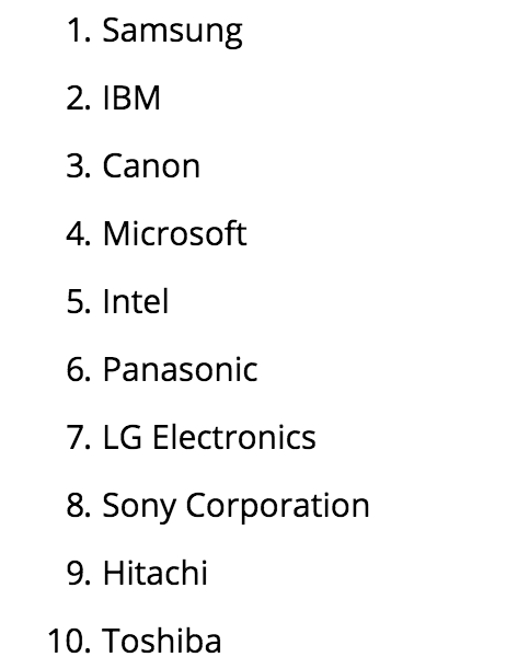 在美国专利100强中,美国公司占据了45席,欧洲公司占据了14席。但是在前10强中,日本和韩国公司占据了7席。排在第5至10位的公司分别是英特尔、松下电器、LG电子、索尼公司、日立公司以及东芝公司。