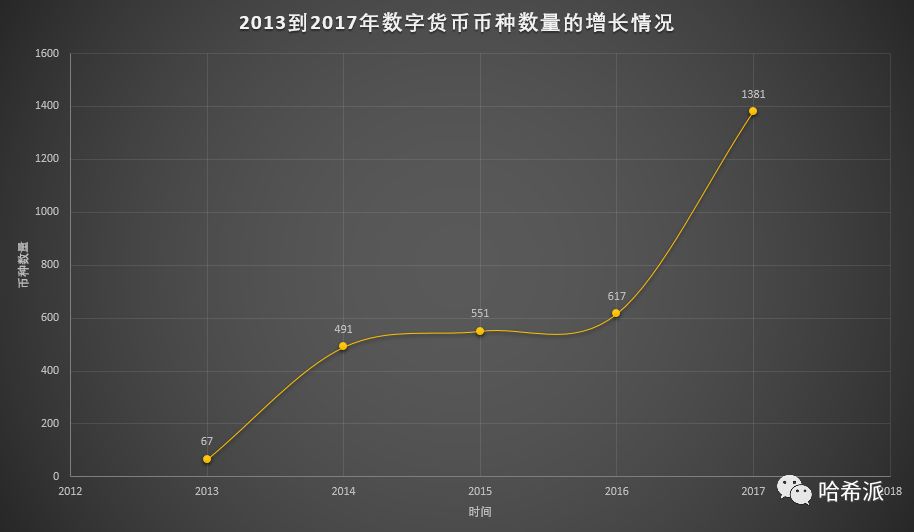 据 Coinmarketcap 数据显示,2017 年数字货币种类达到 1381 种,同比 2016 年增长 123.8%。全年新增数字货币 764 种,较 2016 年 12%的增长率,提升了 111.8 个百分点。