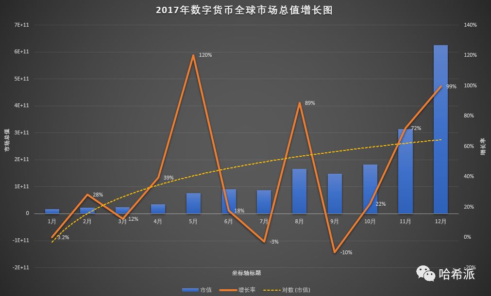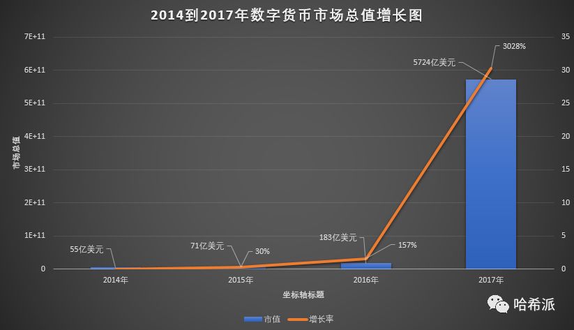 从全球市场总值来看,2017 年数字货币市值最高达到 5724.8 亿美元,同比增长 3028%;与 2015 年 30%以及 2016 年 157%的增速相比,呈现出指数级增长态势。