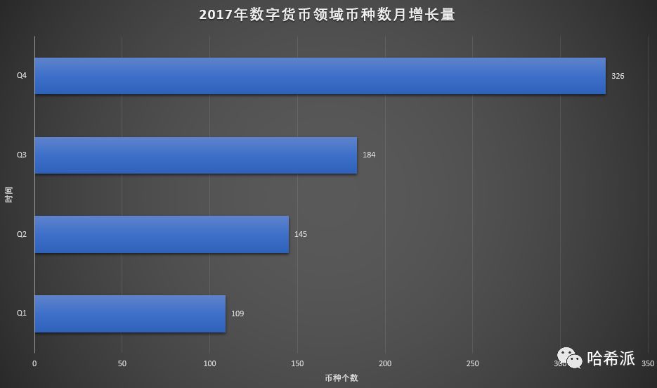 而 Q1、Q2、Q3、Q4 的环比增长率分别为 17.67%、19.18%、22.27%、30.9%,可以看到 2017 年币种数量的增速在逐渐提高。