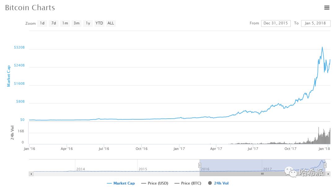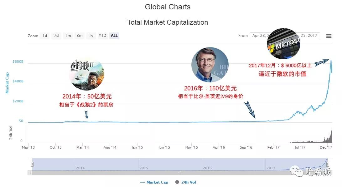 数字货币市场在 2017 年迎来了爆发式的发展,到年末,市场总值达到了 5724.8 亿美元,全年累计增长 3028%;规模由比尔·盖茨九分之二的身价,逐步扩大至与科技巨头微软市值相当的水平。此外,年内日交易最高点达 556.59 亿美元,相当于纽约股票交易所 2017 年的日均交易额。