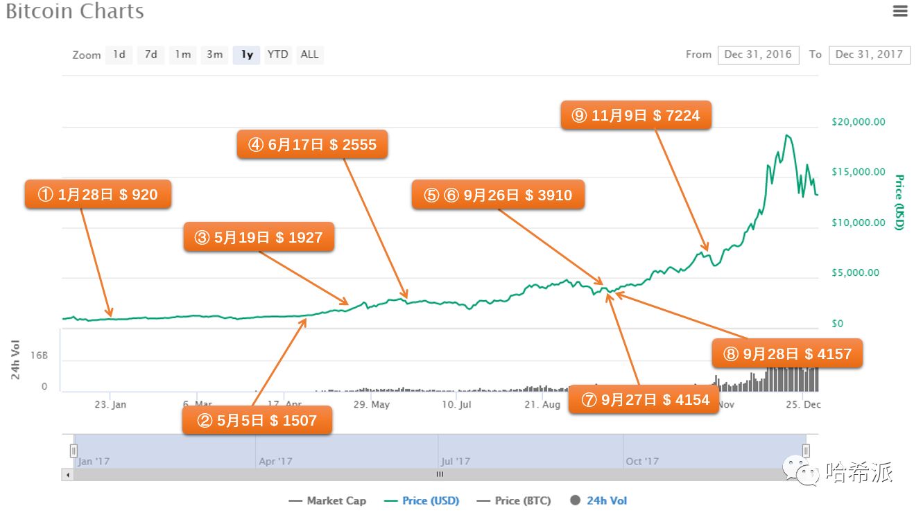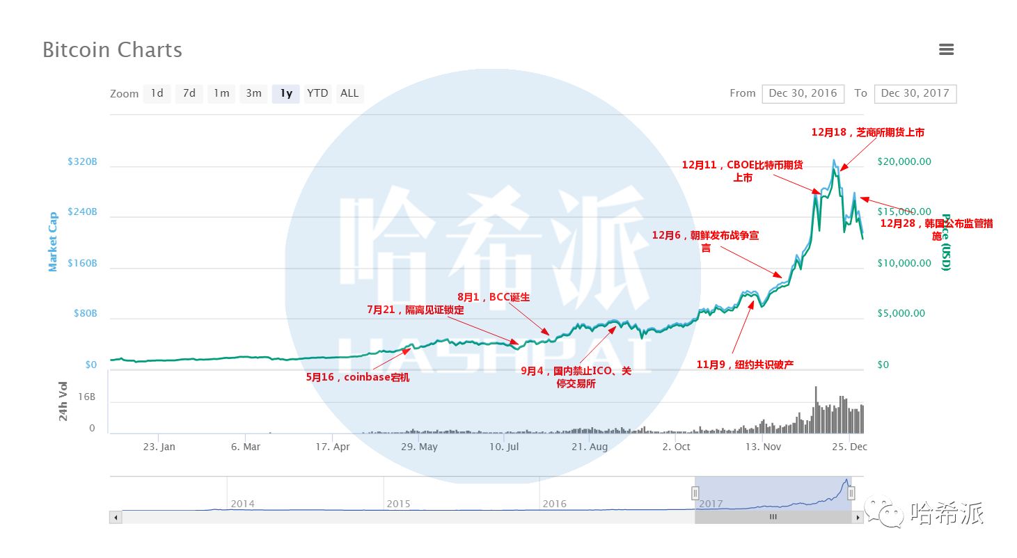 2017 年 12 月:受芝商所以及芝加哥期权交易所上线比特币期货交易信息的影响,比特币价格出现大幅度上涨,并于 12 月 17 日涨至全年最高点 20052.56 美元