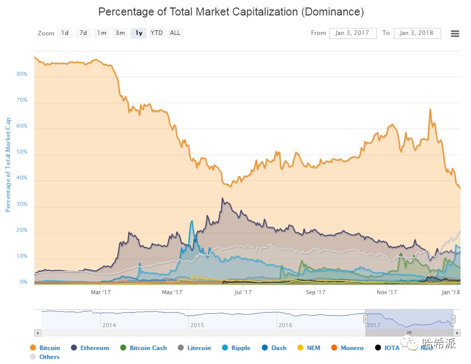 截止 2017 年 12 月 31 日,瑞波币市值占据该市场 21.54%的份额,与 1 月 1 日相比提升 11 个百分点;以太坊在市场上的占比由 32.58%下滑至 16.48%;莱特币在市场上的占比由 9.68%跌至 4.02%;而 2017 年才诞生的比特币现金和 Cardano 则占据市场 8.33%以及 5.06%的份额。此外,市值排名跌至前十以外的达世币、门罗币在市场上占比 2.26%、2.06%;而跻身前十的 IOTA、新经币、恒星币在市场上的占比则为 3.56%、2.90%、2.06%。