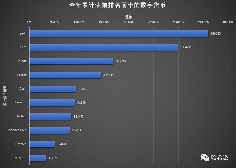 从价格方面来看,2017 年全年累计涨幅排名前十的数字货币有瑞波币(XRP)、新经币(NEM)、阿朵币(Ardor)、恒星币(Stellar)、达世币(Dash)、以太坊(ETH)、Golem、比特币现金(Bitcoin Cash)以及莱特币(Litecoin),价格平均上涨 140.39 倍。
